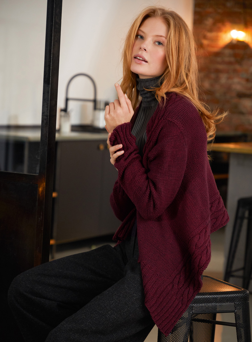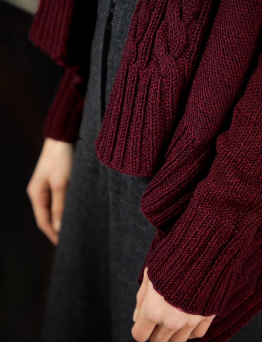 Lana Grossa-kvalitet „Cool Wool Big Mélange“ (100% virgin ull, löplängd ca. 120 m/50 g); ca. 600 (650 - 750 - 800) g mörk röd/svartröd melerad (färg 352); stickor nr. 4, en ca. 80 cm lång rundsticka nr. 4,5, en hjälpsticka