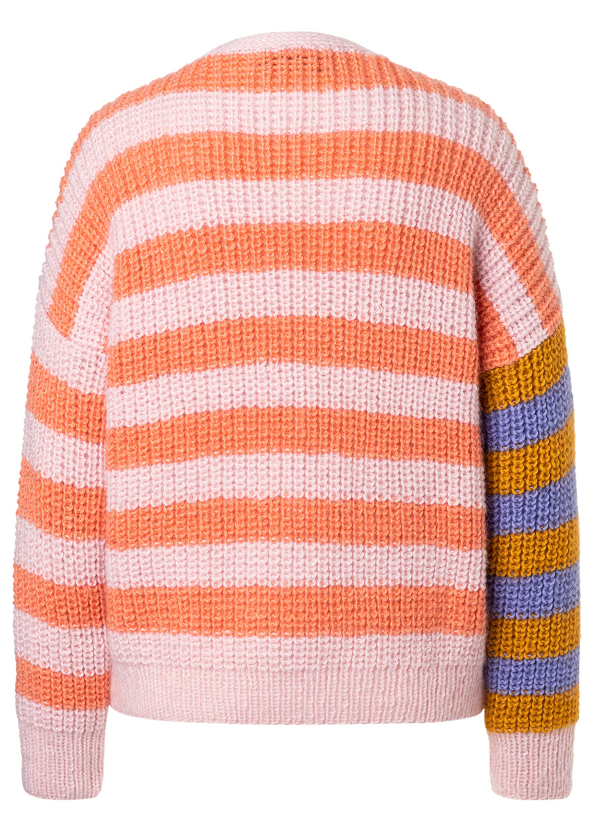 Lana Grossa „Cool Wool Big“ (100% ren ny ull (merino extrafine), löplängd 120 m/50 g), 300 (350 – 400) g mjukrosa (färg 605), 200 (250 – 300) g lax (färg 993), 100 (150 -150) g saffransgul (färg 986) och 50 (100 – 100) g lila (färg 1013) och Lana Grossa „Silkhair“ (70% mohair (superkid), 30% silke, löplängd 210 m/25 g), 100 (100 – 125) g mjukrosa (färg 93), 50 (75 – 100) g lax (färg 159), 25 (50 – 50) g vioblå (färg 182) och 25 (50 – 50) g guldgul (färg 176); stickor nr. 4,5 och 5, samt 5 knappar från Union Knopf, art. 38564, färg 20, Ø 23 mm. OBS: Modellen stickas med dubbla trådar, 1 tråd Cool Wool Big och 1 tråd Silkhairi följande färgsammansättning: mjukrosa/mjukrosa, lila/ vioblå, lax/lax, saffransgul/guldgul.