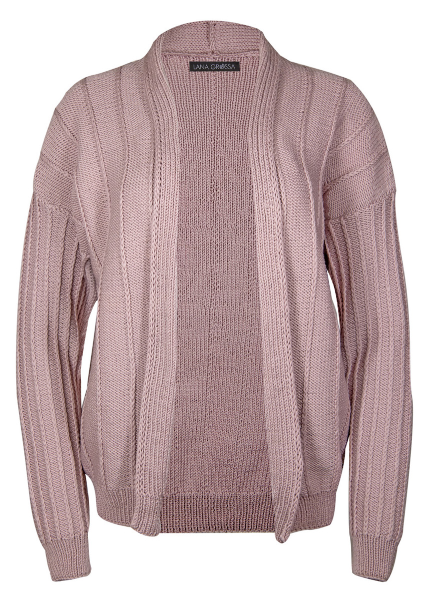 Lana Grossa Cool Wool Big (100% ren ny ull, löplängd 120 m/50 g), 650 (700 – 750) g rosenträ (färg 953); stickor nr. 3,5 och 4,5.