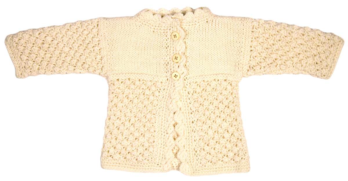 Lana Grossa-kvalitet ”Cool Wool Cashmere” (90 % ren ny uld (ekstrafin merino), 10 % cashmere, løbelængde = ca. 160 m / 50 gr.): 100(100-150) gr råhvid (fv 12), strikkepinde nr. 3½, hæklenål nr. 3, 3 knapper 13 mm Ø.