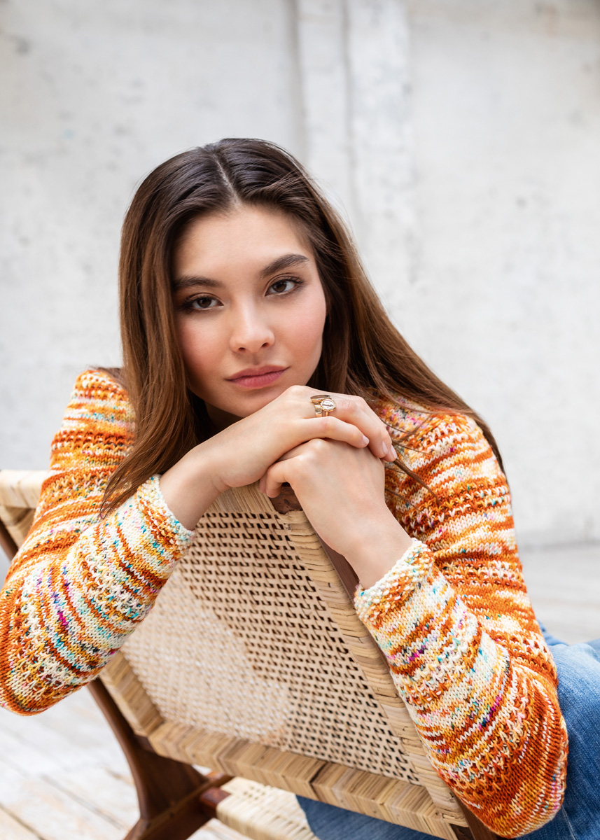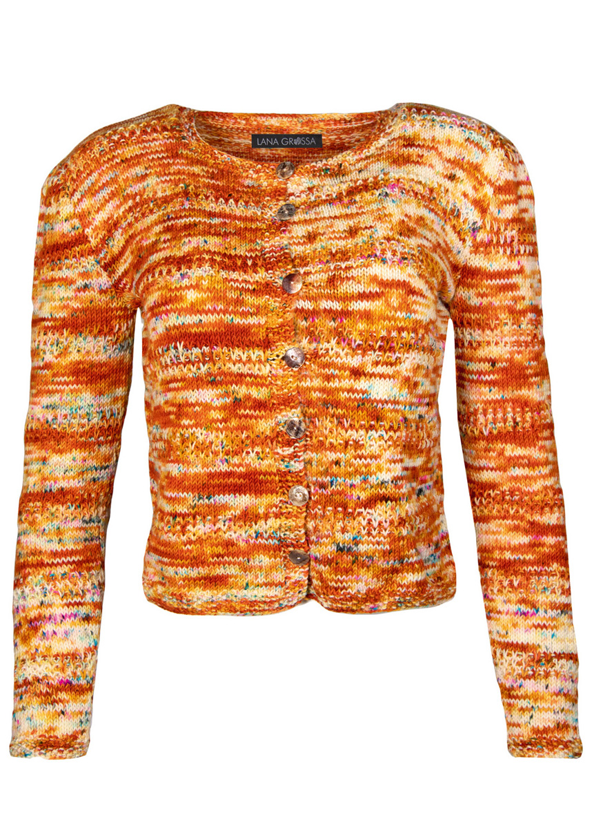 Lana Grossa Cool Wool hand-dyed (100% ren ny ull, löplängd 320 m/100 g), 500 (500 – 600) g rost/orange/råvit/gul/pink/grön (färg 101); stickor nr. 4,5, 1 rundsticka nr. 4, 40 cm lång, 1 virknål nr. 3,5 till jackan i Cool Wool, 7 knappar från UNION KNOPF, Art. 37604, färg 12, storlek 18 mm.