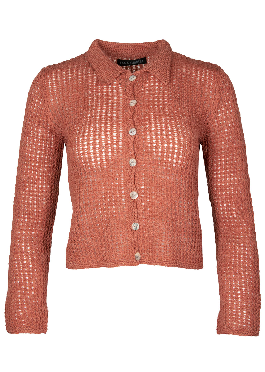 Lana Grossa Cool Wool (100% ren ny ull, löplängd 160 m/50 g), 400 (450 – 500) g karamell (färg 2054); stickor nr. 3, 5 och 5, 5, 1 virknål nr. 3, 5 och 4, 7 knappar från UNION KNOPF, Art. 37604, färg 12, st. 15 mm.