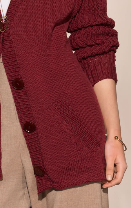Lana Grossa-kvalitet ”Cool Wool” (100 % ren ny uld, løbelængde = ca. 160 m / 50 gr.): ca. 650(700-750) gr. burgunder (fv. 2026), strikkepinde nr. 4 og 4½, 4 knapper fra Union Knopf, art. 450 188, burgunder, 30 mm Ø.