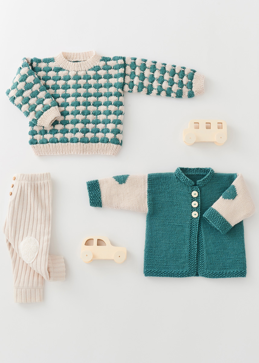 Lana Grossa-kvalitet ”Cool Wool” (90 % ren ny uld (merino), 10 % polyamid, løbelængde = ca. 150 m / 25 gr.): ca. 100 gr lys søgrøn (fv 2072) og 50 gr ecru (fv 432), strikkepinde nr. 3½, rundpind nr. 3½, 40 cm, 3 knapper, 16 mm Ø.