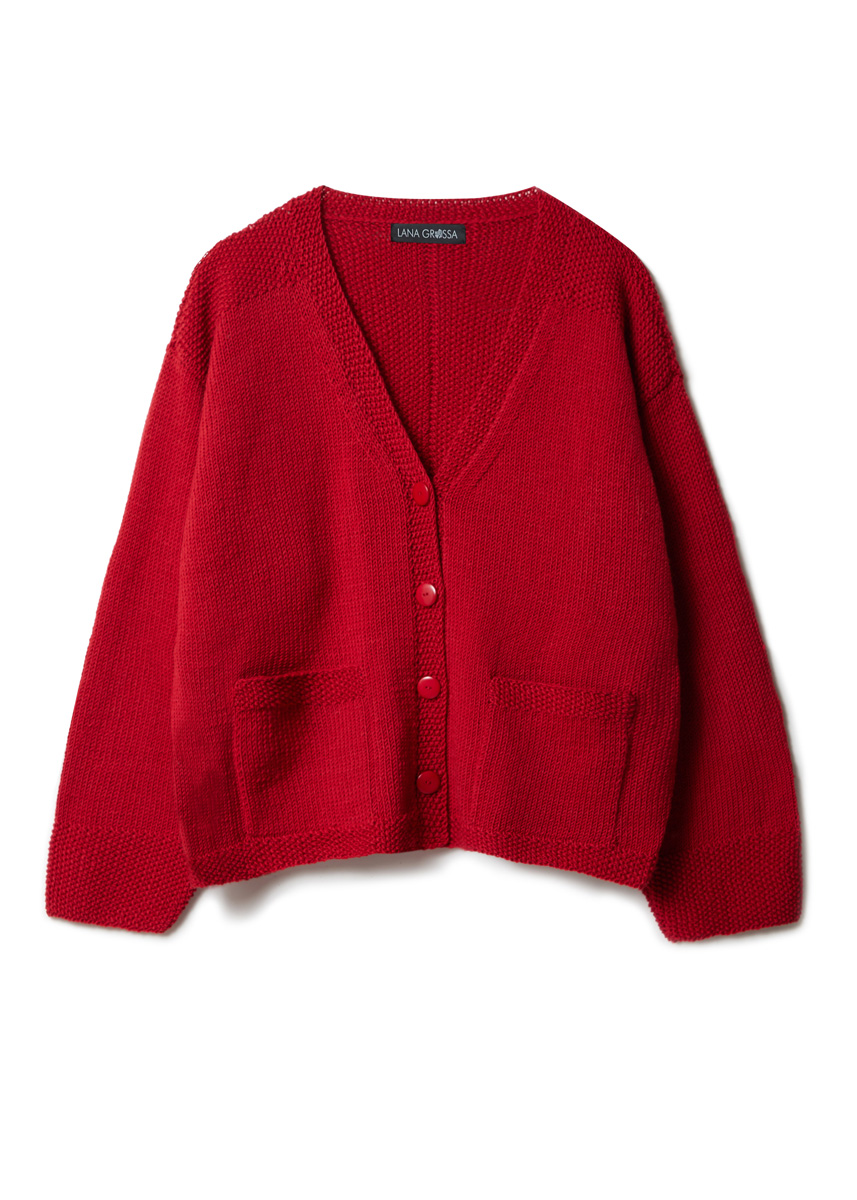 Lana Grossa Cool Wool (100% ren ny ull  (extrafin merino), löplängd 160 m/50 g), 550 (600 – 650) g mörkröd (färg 514); stickor nr. 3,5 och 4, 1 rundsticka nr. 3,5, 120 cm lång och 4 knappar från UNION KNOPF, Art. 454233, färg 50, Ø 20 mm.