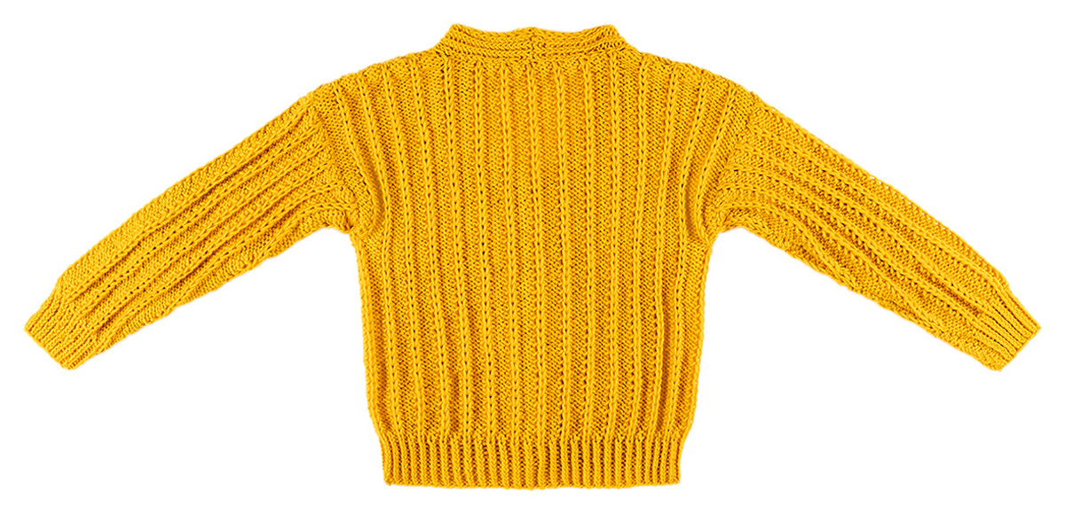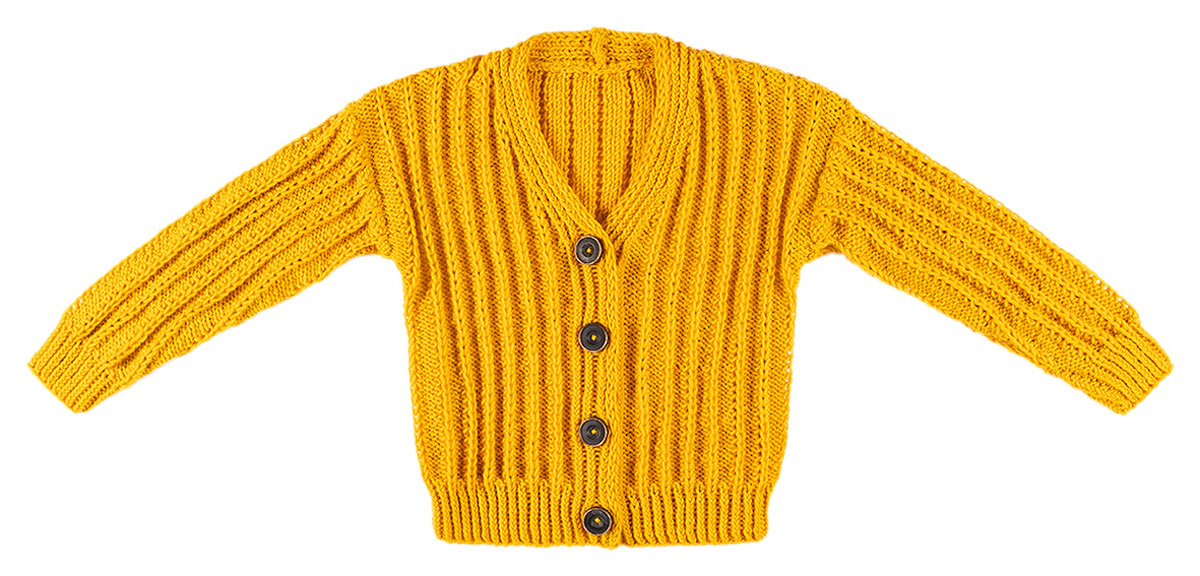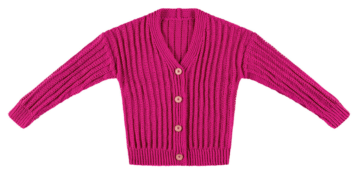 Lana Grossa Cool Wool (100% ren ny ull, löplängd 160 m/50 g), 200 (250 – 300 – 350) g guldgul (färg 2005) eller cyklamen (färg 537); stickor nr. 3 och 3, 5, 4 knappar från UNION KNOPF, färg brun eller rosa, storlek 20 mm.
