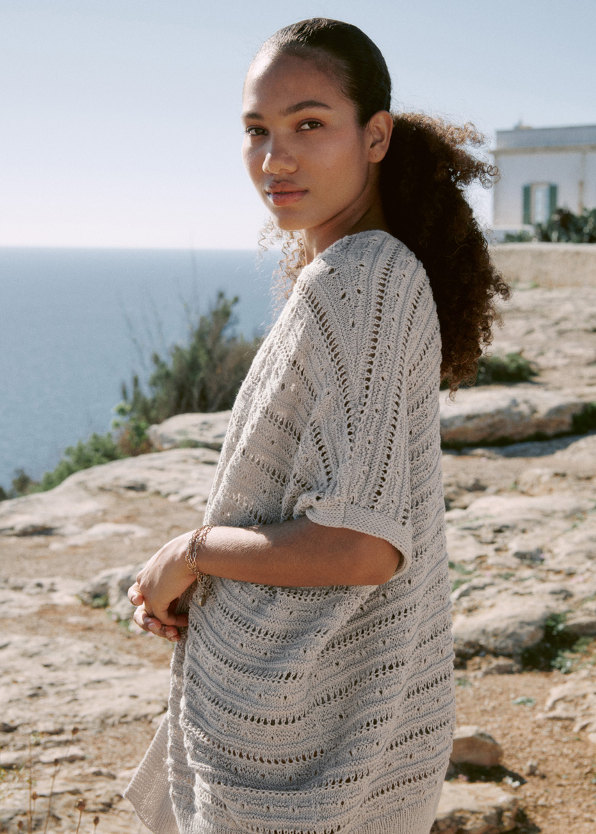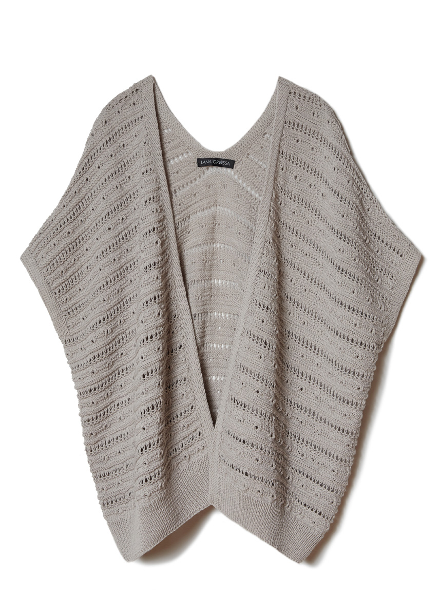 Lana Grossa-kvalitet „Cotton Wool“ (53 % ren ny uld (ekstrafin merino), 47 % bomuld, løbelængde = ca. 195 m / 50 gr.): ca. 200(250) gr gråbeige (fv 8), strikkepinde nr. 3 og 3½.