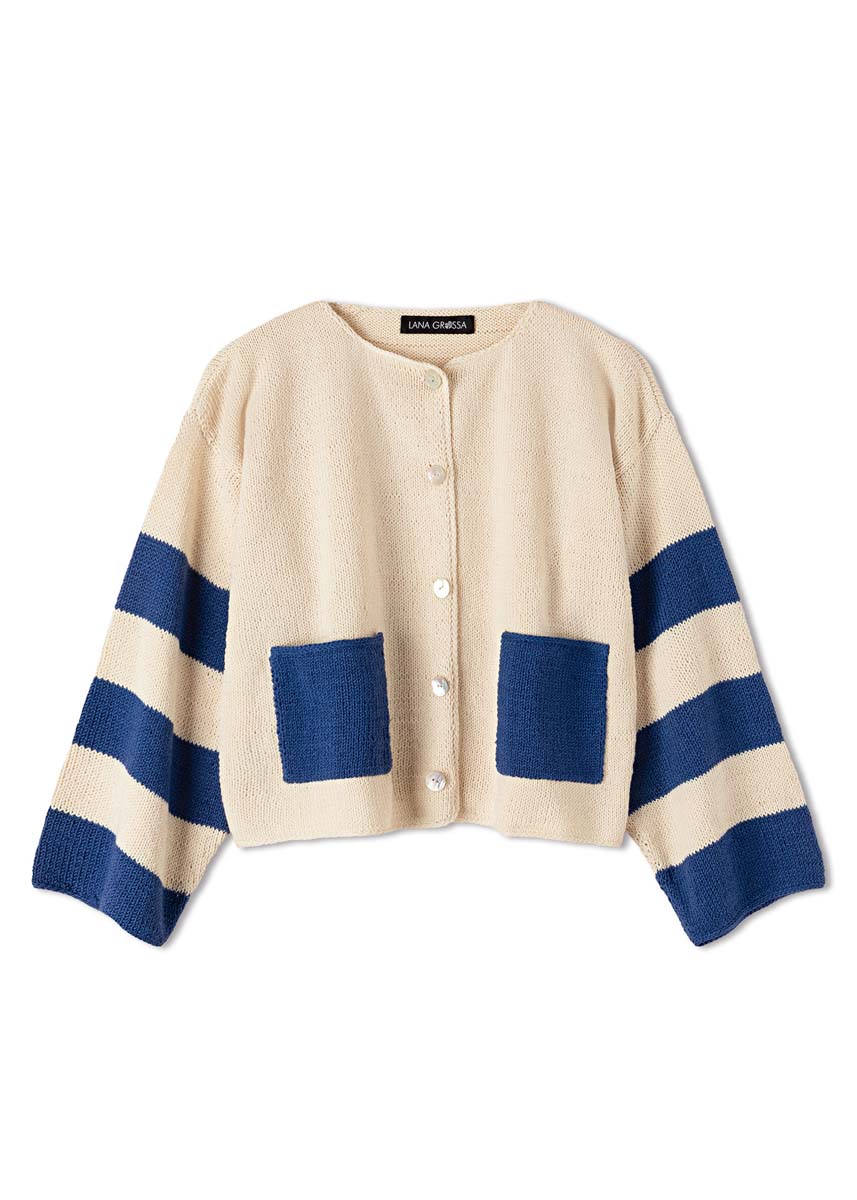 Garn: Lana Grossa «Cotton Wool» (53 % ren ull (merino extrafine), 47 % bomull, LL = ca. 195 m/50 g): ca. 250 (300 – 350) g krem (frg 12) og ca. 100 g mørk blå (frg 24) Pinner: Nr. 3,5