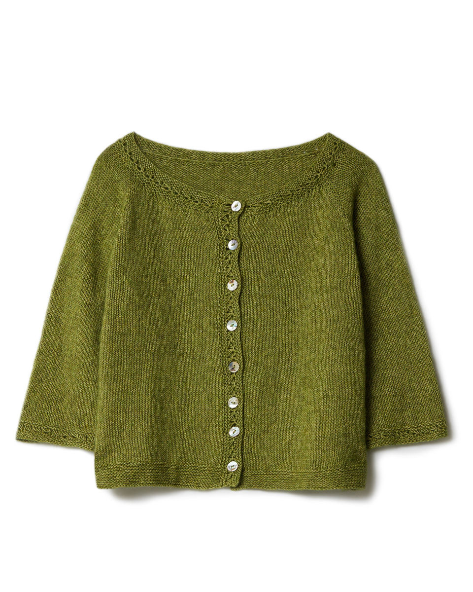 Materiale: Lana Grossa-kvalitet ”Ecopuno” (72 % bomuld, 17 % ren ny uld ( merino), 11 % alpaka (baby), løbelængde = ca. 215 m / 50 gr.): ca. 200(200-250-250-300- 350-400) gr æblegrøn (fv 2), rundpind nr. 3, 100 cm, rundpind nr. 3.25, 100 cm, rundpind nr. 4, 100 cm, 8 maskemarkører (mm), 2 maskemarkører i afvigende farve, 2 maskeholdere, 7-11 knapper med 1 cm Ø, stoppenål, saks.