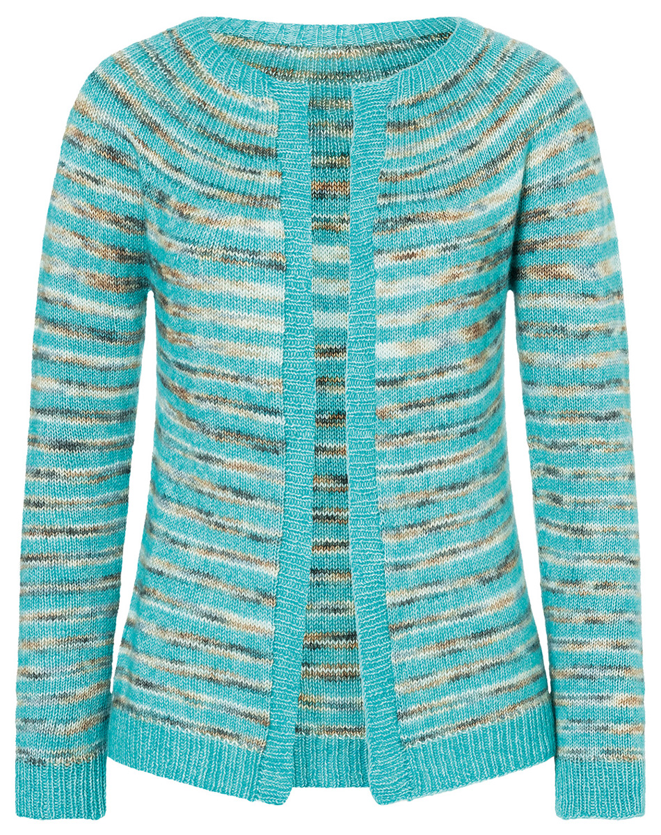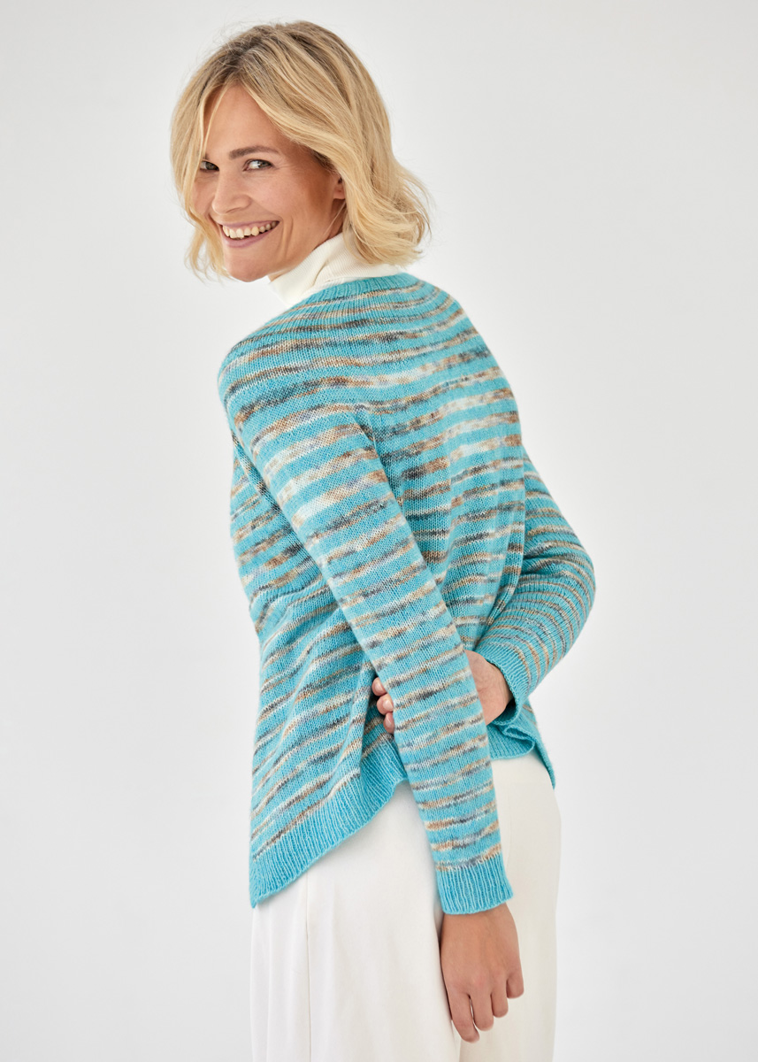 Lana Grossa-kvalitet ”Ecopuno hand-dyed” (72 % bomuld, 17 % ren ny (merino), 11 % (baby) alpaka, løbelængde = ca. 215 m / 50 gr.): ca. 150 (200 – 200) gr sunita (fv 512) og Lana Grossa-kvalitet ”Ecopuno” (72 % bomuld, 17 % ren ny (merino), 11 % (baby) alpaka, løbelængde = ca. 215 m / 50 gr.): ca. 200 (250 – 250) gr turkis (fv 28), strikkepinde nr. 3½ og 4, rundpind nr. 3½, 60 cm, strømpepinde nr. 3½ og 4.