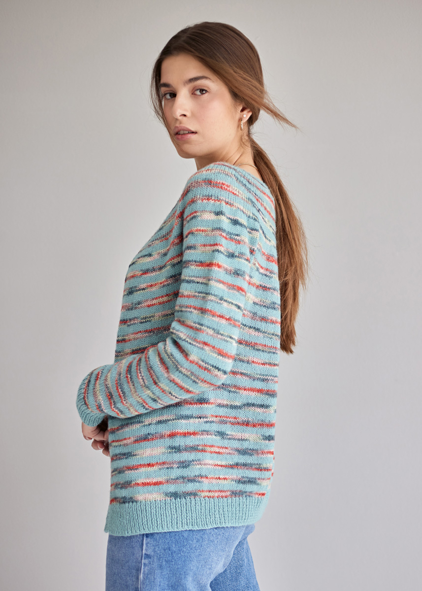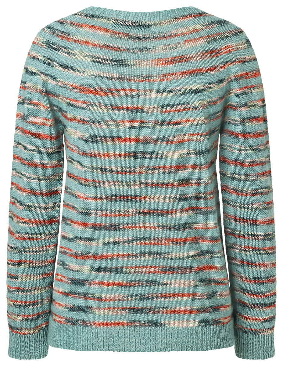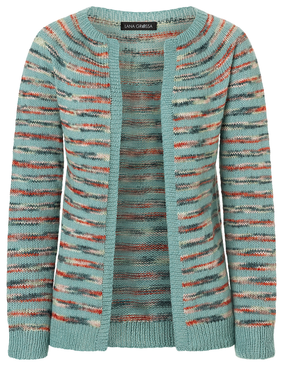 Lana Grossa-kvalitet „Ecopuno hand-dyed“ (72% bomull, 17% ren ny ull (merino), 11% (baby) alpacka, löplängd 215 m/50 g), 150 (200 – 200) g Sawan (färg 517) och Lana Grossa-kvalitet „Ecopuno“ (72% bomull, 17% ren ny ull (merino), 11% (baby) alpacka, löplängd 215 m/50 g), 200 (250 – 250) g Mintgrün (färg 44); stickor nr. 3,5 och 4, 1 rundsticka nr. 3,5, 60 cm lång, strumpstickor nr. 3,5 och 4.
