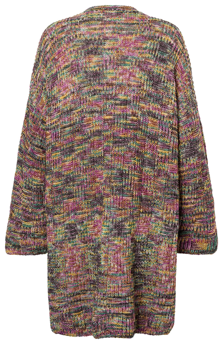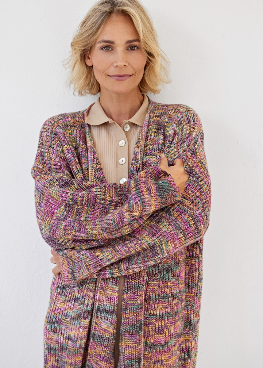 Lana Grossa-kvalitet ”Ecopuno hand-dyed” (72 % bomuld, 17 % ren ny (merino), 11 % (baby) alpaka, løbelængde = ca. 215 m / 50 gr.): ca. 650(750) gr suman (fv 513), strikkepinde nr. 3½, rundpind nr. 3½, 120 cm.