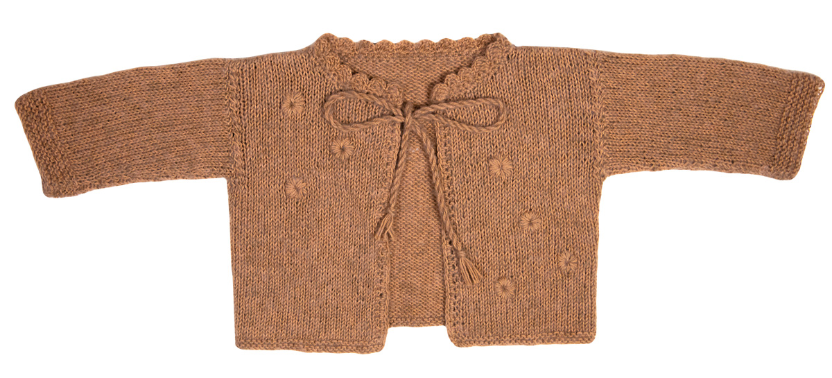 Lana Grossa-kvalitet ”Ecopuno” (72 % bomuld, 17 % ren ny merino, 11 % baby alpaka, løbelængde = ca. 215 m / 50 gr.): ca. 100 gr camel (fv 32), strikkepinde nr. 4, hæklenål nr. 3½.