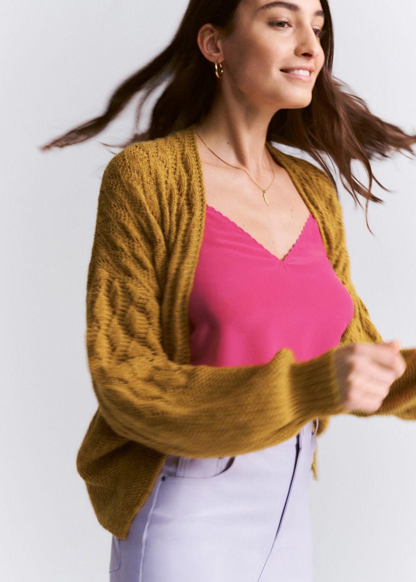 Lana Grossa-kvalitet „Ecopuno“ (72 % bomull, 17 % ren ny ull (merino), 11 % (baby) alpacka, löplängd 215 m/50 g): ca. 400 g currygul (färg 53); stickor nr. 3 och 4.