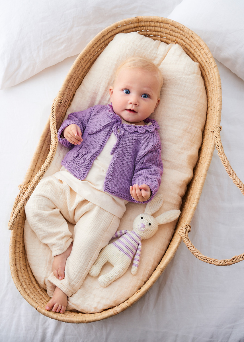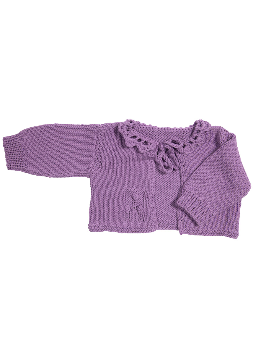 Lana Grossa-kvalitet ”Elastico” (96 % bomuld, 4 % polyester, løbelængde = ca. 160 m / 50 gr.): 100(150/150) gr syren-lilla (fv 164), strikkepinde nr. 4, hæklenål nr. 3½.