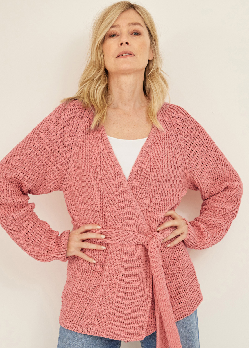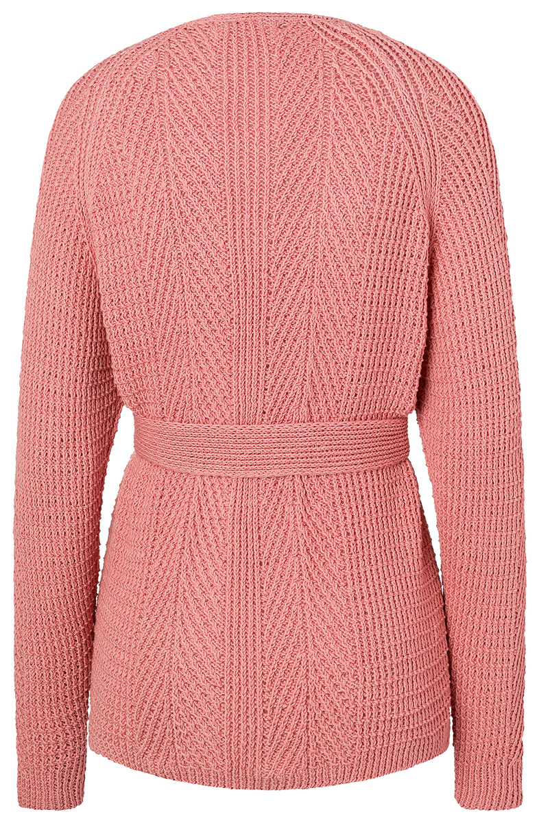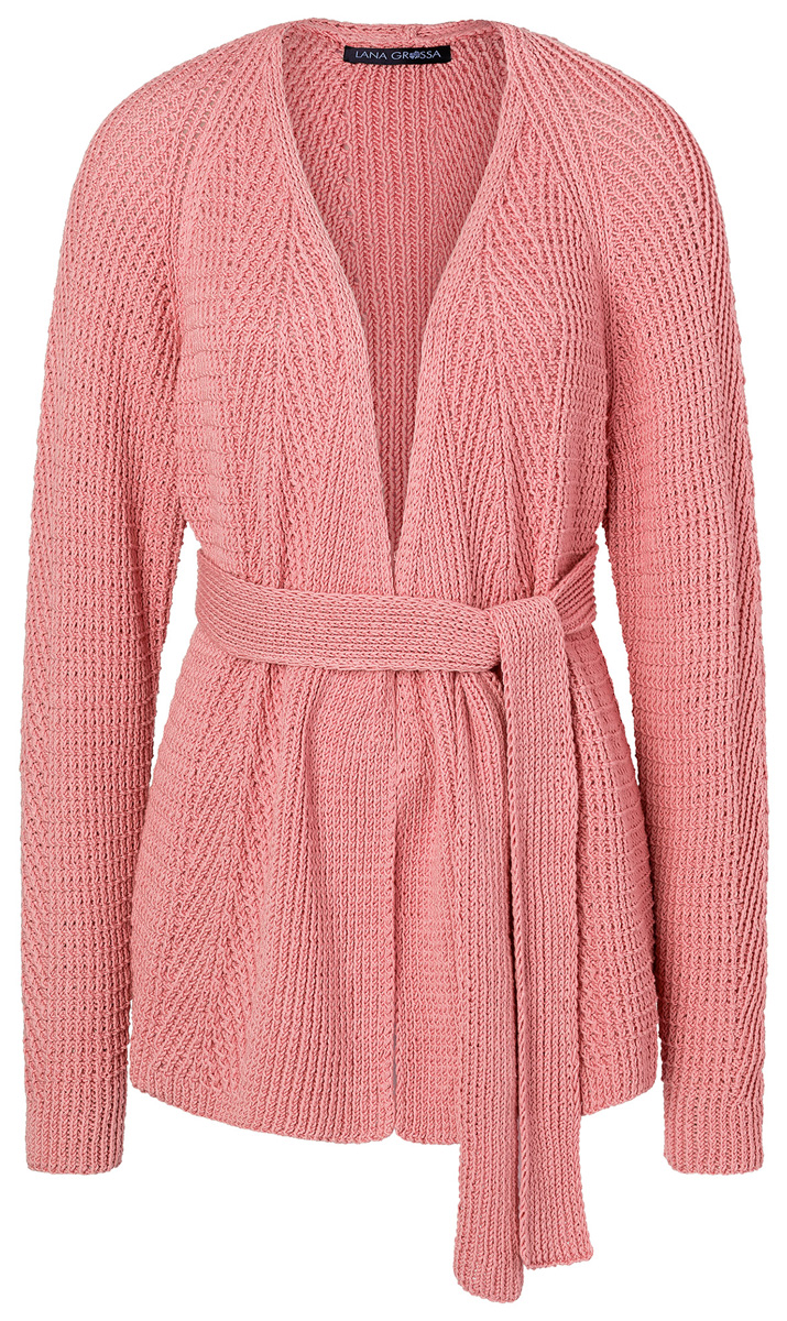 Lana Grossa Elastico (96% bomull, 4% polyester (elité), löplängd 160 m/50 g), 750 (800 – 850) g lax (färg 132); stickor nr. 3 och 3,5, 1 hjälpsticka/flätsticka.