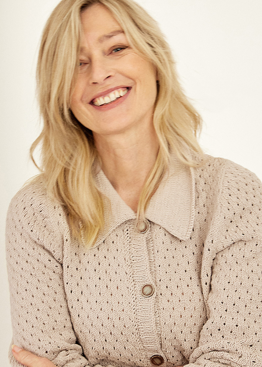 Lana Grossa Elastico (96% bomull, 4% polyester (elité), löplängd 160 m/50 g), 450 (500 – 550) g beige (färg 97); stickor nr. 2,5 och 3,5, 1 rundsticka nr. 2,5, 40 cm lång, 1 virknål nr. 3 och 5 knappar från UNION Knopf, Art. 453463, färg 16, storlek 20 mm.