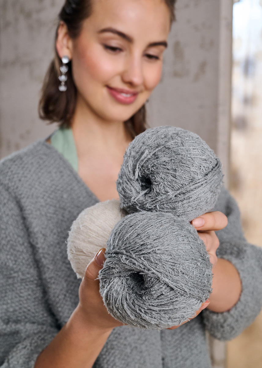 Lana Grossa-Kvalitet Ella (100 % bomuld, løbelængde 130 m/50 g), 500 (550 – 600) g grå (farve 13); strikkepinde nr. 3½ og 4½, samt 1 hæklenål nr. 3½.