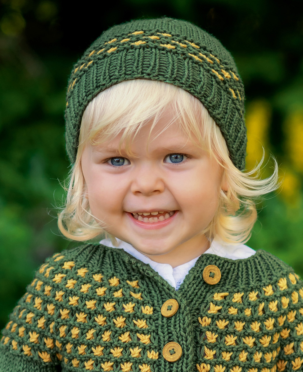 Lana Grossa-kvalitet ”Fourseason” (45 % ren ny uld (ekstrafin merino), 40 % (bio) bomuld, 15 % (rec.) cashmere, løbelængde = ca. 105 m / 50 gr.): ca. 150(200-200) gr grøn (fv 7) og 50 gr gul (fv 8), strikkepinde nr. 4½, rundpind nr. 4½, 60 cm, strømpepinde nr. 4½, 4 knapper 23 mm Ø.