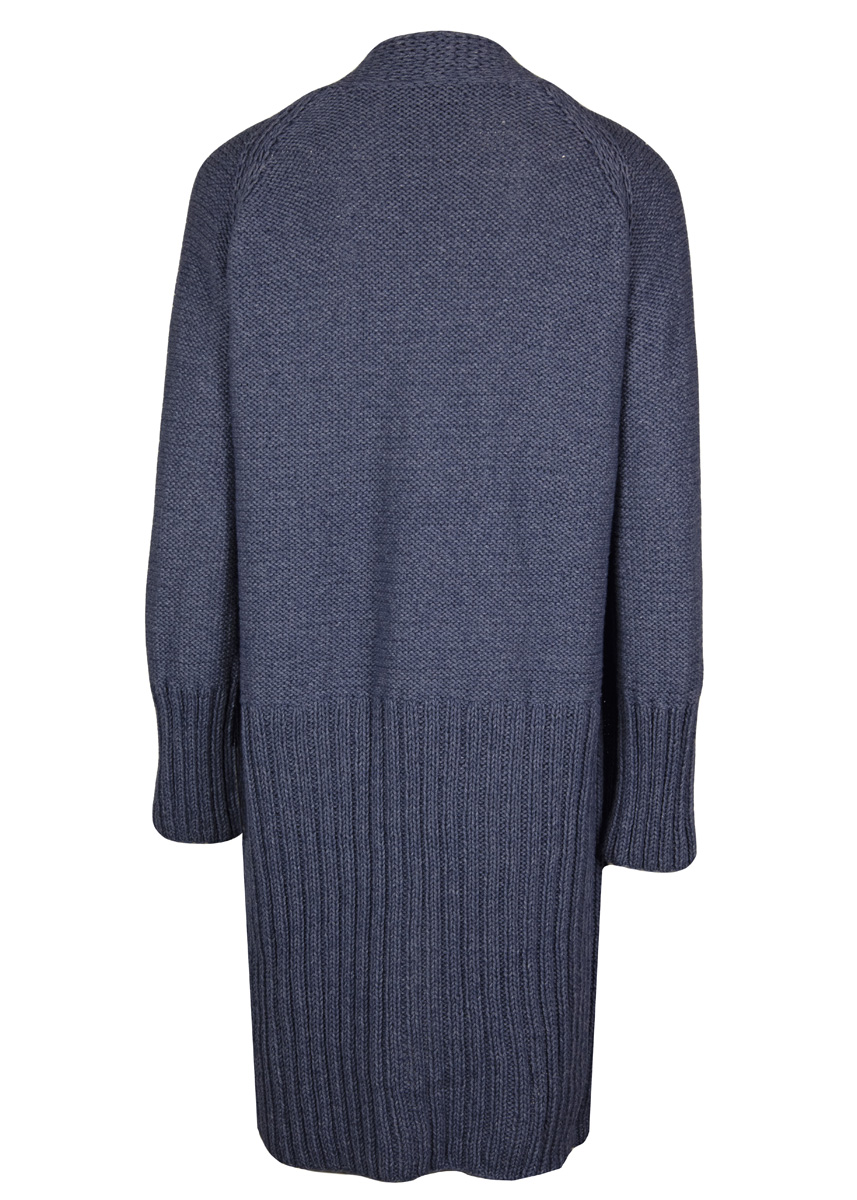 Lana Grossa-kvalitet „Fourseason” (45 % ekologisk ren ny ull (merino extrafin), 40 % ekologisk bomull, 15 % återvunnen kashmir, löplängd = ca. 105 m/50 g): ca. 650 (700) g jeans (färg 3); stickor nr. 4,5 och 5,5.