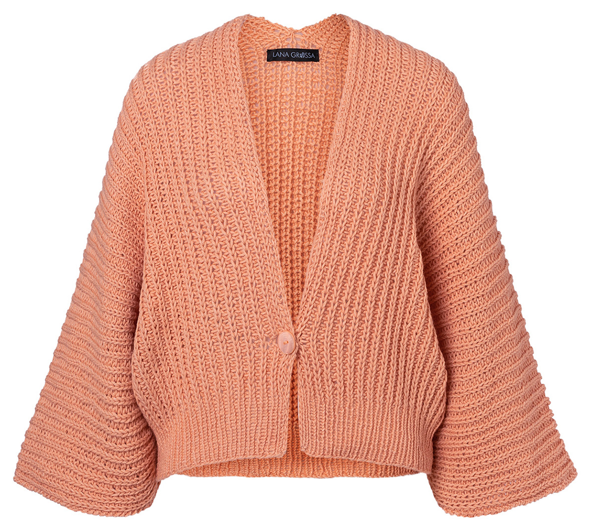 Lana Grossa Fourseason (45% bio ren ny ull (merino extrafin), 40% bomull (bio), 15% återvunnen kashmir, löplängd 105 m/50 g), 450 (500 – 500 – 550) g aprikos (färg 20); stickor nr. 4 och 1 rundsticka nr. 5, 80 cm lång, 1 virknål nr. 4, 1 knapp från UNION knapp, färg aprikos, storlek 25 mm.