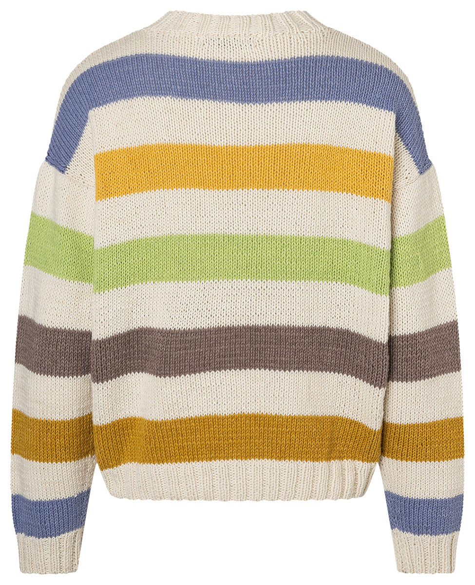 Lana Grossa Fourseason (45% bio ren ny ull (merino extrafin), 40% bio bomull, 15% återvunnen kashmir, löplängd 105 m/50 g), 350 (400 – 450) g råvit (färg 12), 100 g curry (färg 32), 100 g taupe (färg 31), 100 g lavendel (färg 29), 100 g gulgrön (färg 23) och 50 g gul (färg 8); stickor nr. 4 och 5, 1 rundsticka nr. 4, 120 cm lång, 3 knappar från UNION KNOPF, mörk beige, storlek 23 mm.