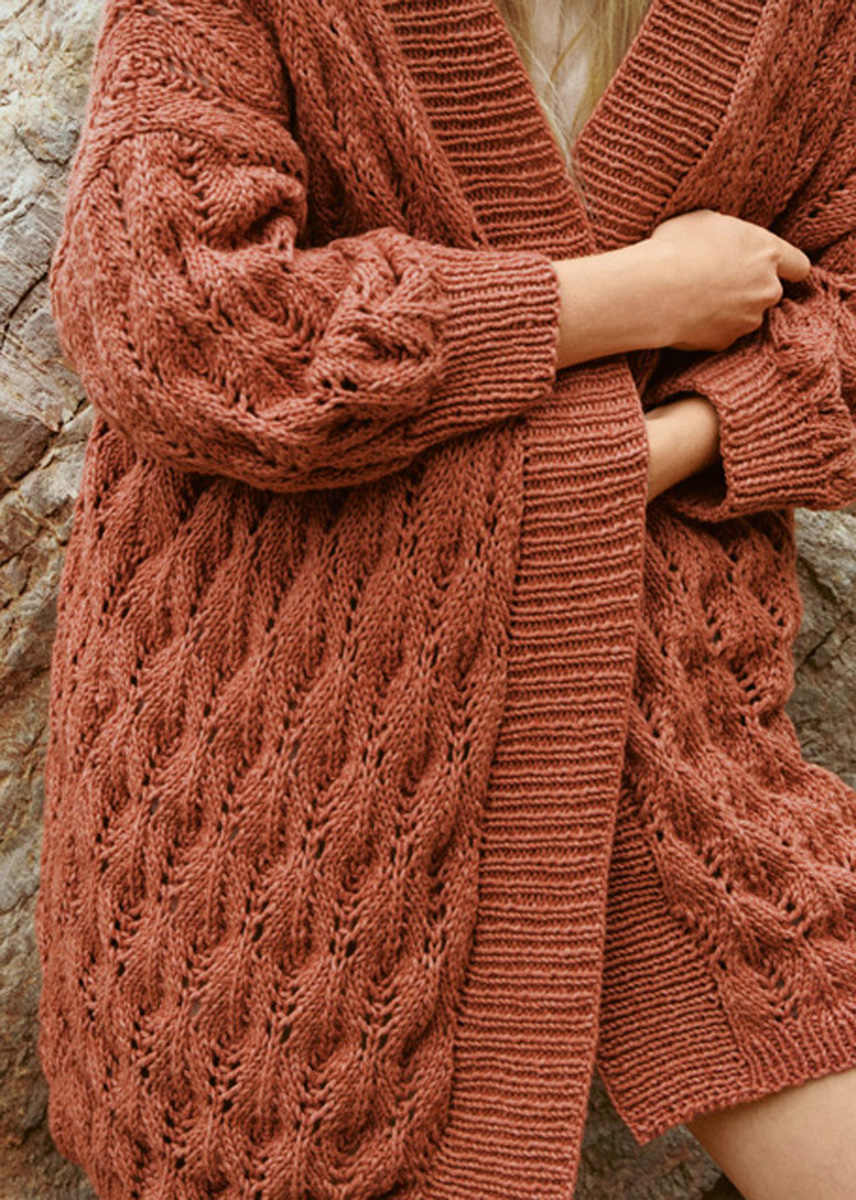 Lana Grossa-kvalitet „Fourseason” (45 % (bio) ren ny ull (extrafin merino), 40 % (bio) bomull, 15 % återvunnen kashmir, löplängd = ca. 105 m/50 g): ca. 550 g rost (färg 38); stickor nr. 4 och 5, 1 rundsticka nr. 4, 120 cm lång.