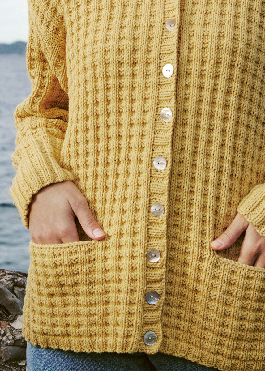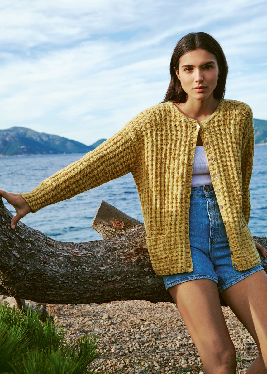 Lana Grossa-kvalitet „Fourseason” (45 % (bio) ren ny ull (extrafin merino), 40 % (bio) bomull, 15 % återvunnen kashmir, löplängd = ca. 105 m/50 g): ca. 600 (650 – 700) g gul (färg 8); stickor nr. 4 och 4,5, 1 rundsticka nr. 4, 80 cm lång; 10 pärlemorknappar natur, ø 18 mm.