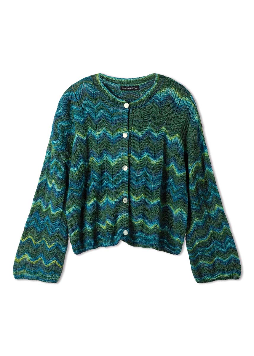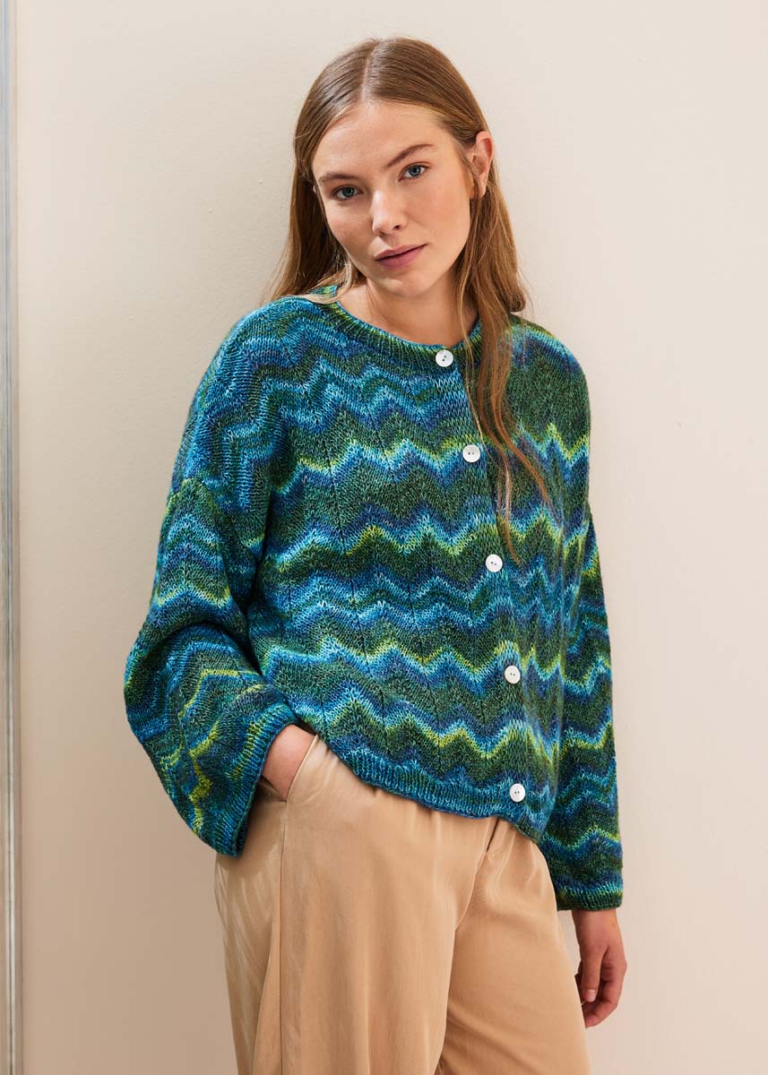 Lana Grossa-kvalitet „Gianna“ (80 % bomull (bio), 15 % ren ny ull (merino), 5 % kashmir, löplängd = ca 180 m/50 g): ca 350 (450 - 550) g blå/grön/turkos/grå (färg 5); stickor nr. 4 och 4,5; 5 pärlemorknappar, diameter 18 mm.