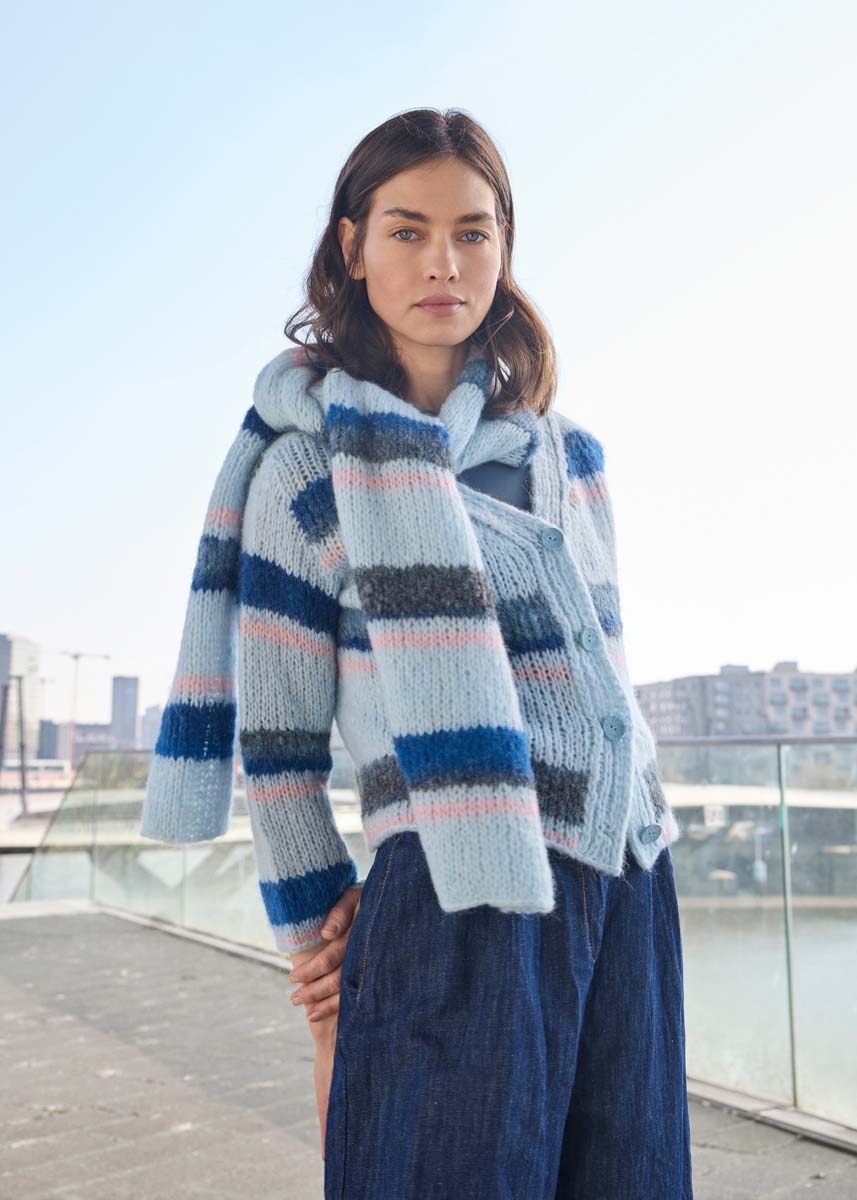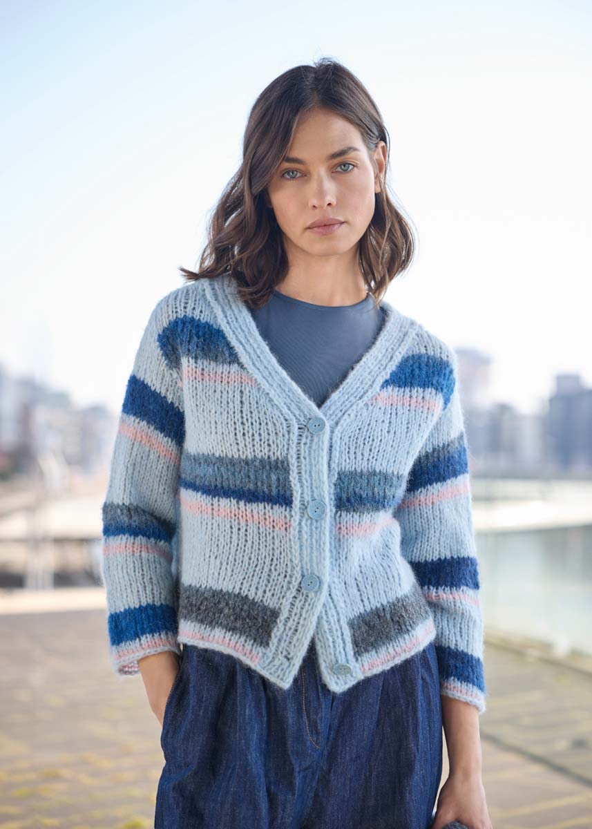 Lana Grossa-kvalitet „Alpaca Air II“ (50 % alpakka (baby), 27 % polyamid, 14 % bomull, 9 % ren ny ull (merino ), løpelengde = ca 140 m/50 g): 100 (150 - 150 - 200) g pastellblå (farge 28), 50 (50 - 100 - 100) g gammelrosa (farge 29), Lana Grossa-kvalitet „Gigante“ (70 % alpakka (fin), 30 % polyamid, løpelengde = ca 300 m/100 g): ca 100 (100 - 100 - 100) g mørkblå/nattblå/gråblå/grå (farge 7); kort og lang rundpinne nr. 7; lang rundpinne nr. 6; 4 knapper i lysblå farge 70, diameter 23 mm, Artikel-Nr 453081 fra Union Knopf.