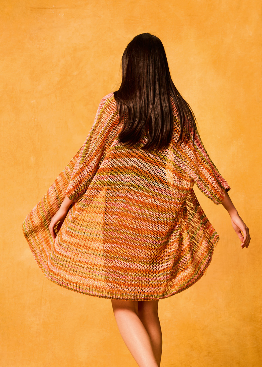 Lana Grossa-kvalitet „Gomitolo Alga“ (65 % bomull, 23 % viskose (bambus), 12 % seacell, løpelengde = ca 280 m/100 g): ca 4 (5 - 5 - 6) nøster = ca 400 (500 - 500 - 600) g gulgrønn/ guloransje/rødoransje/laks/hvit/tyrkis/oker/mykgrønn/rosa (farge 2022); pinner nr. 3,5; heklenål nr. 5.