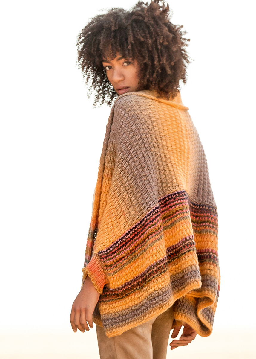 Lana Grossa Gomitolo Finito (100% ren ny ull merino, løpelengde 520 m/200 g), 600 g okker/grålilla/petrol/tyrkis/rosa/syrin (farge 558); 1 rundpinne nr. 4,5 og settpinner nr. 4.