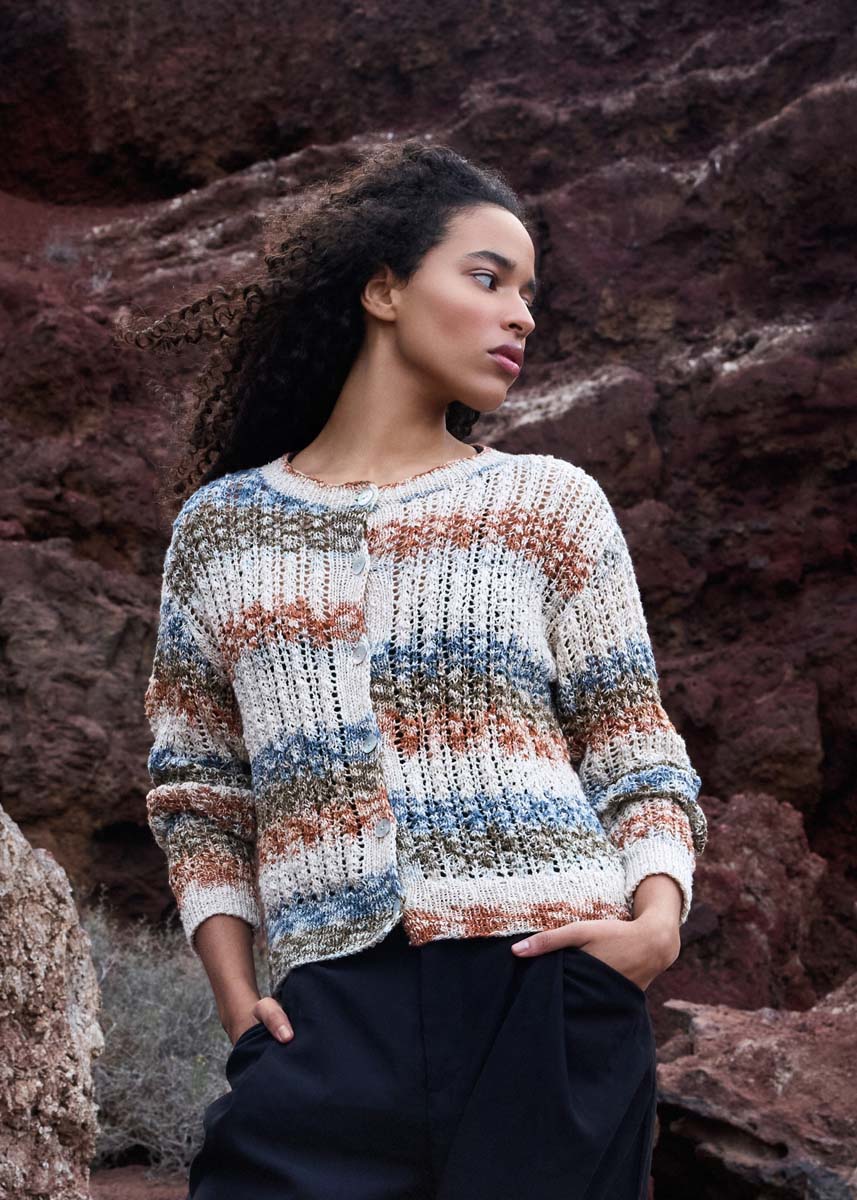 Lana Grossa-kvalitet „Gomitolo Hippie“ (66 % bomull, 30 % hamp, 4 % lin, løpelenge = ca 300 m/100 g): 4 (4 - 5 - 5) nøster = ca 400 (400 - 500 - 500) g blågrå/umbra/nougat/rosabeige/natur (farge 3038); pinner nr 2,5 og nr 3, 1 rundpinne nr 2,5; 6 perlemorknapper ca 18 mm diameter.