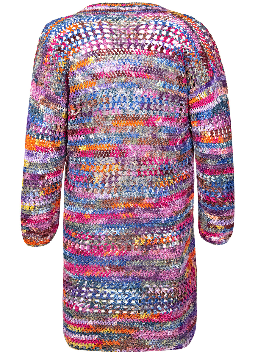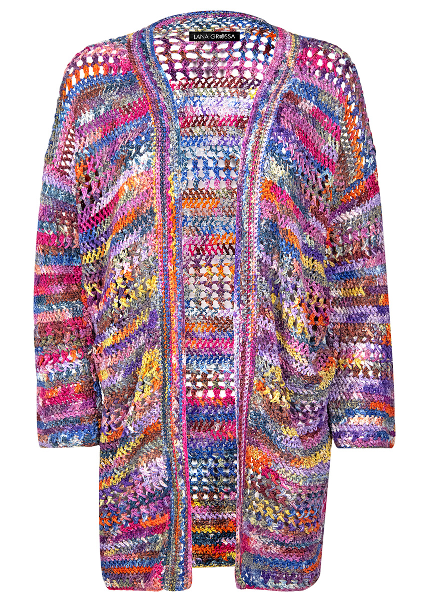 Lana Grossa-kvalitet ”Gomitolo Pazzo” (52 % bomuld, 48 % polyakryl, løbelængde = ca. 260 m / 100 gr.): ca. 600(600-700) gr orange/citrusgul/petrol/fuchsia broget (fv 815), hæklenål nr. 3½ og 6.