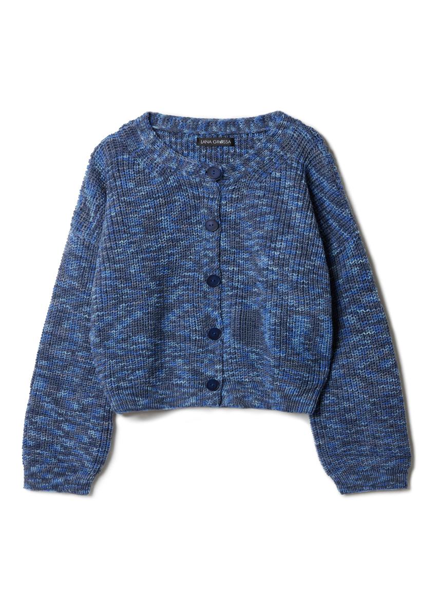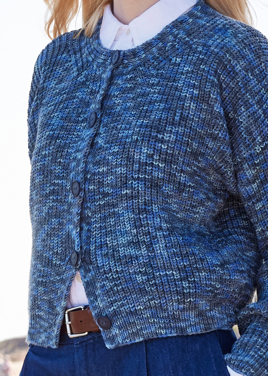 Lana Grossa Cool Wool Print (100 % ren ny ull (merino), LL = ca. 160 m/50 g), 700 (750 – 800 – 850) g jeans/ gråblå/royal (frg 716) Pinner: Nr. 3 og 3,5 Tilbehør: Fem knapper, ca. 24 mm Ø
