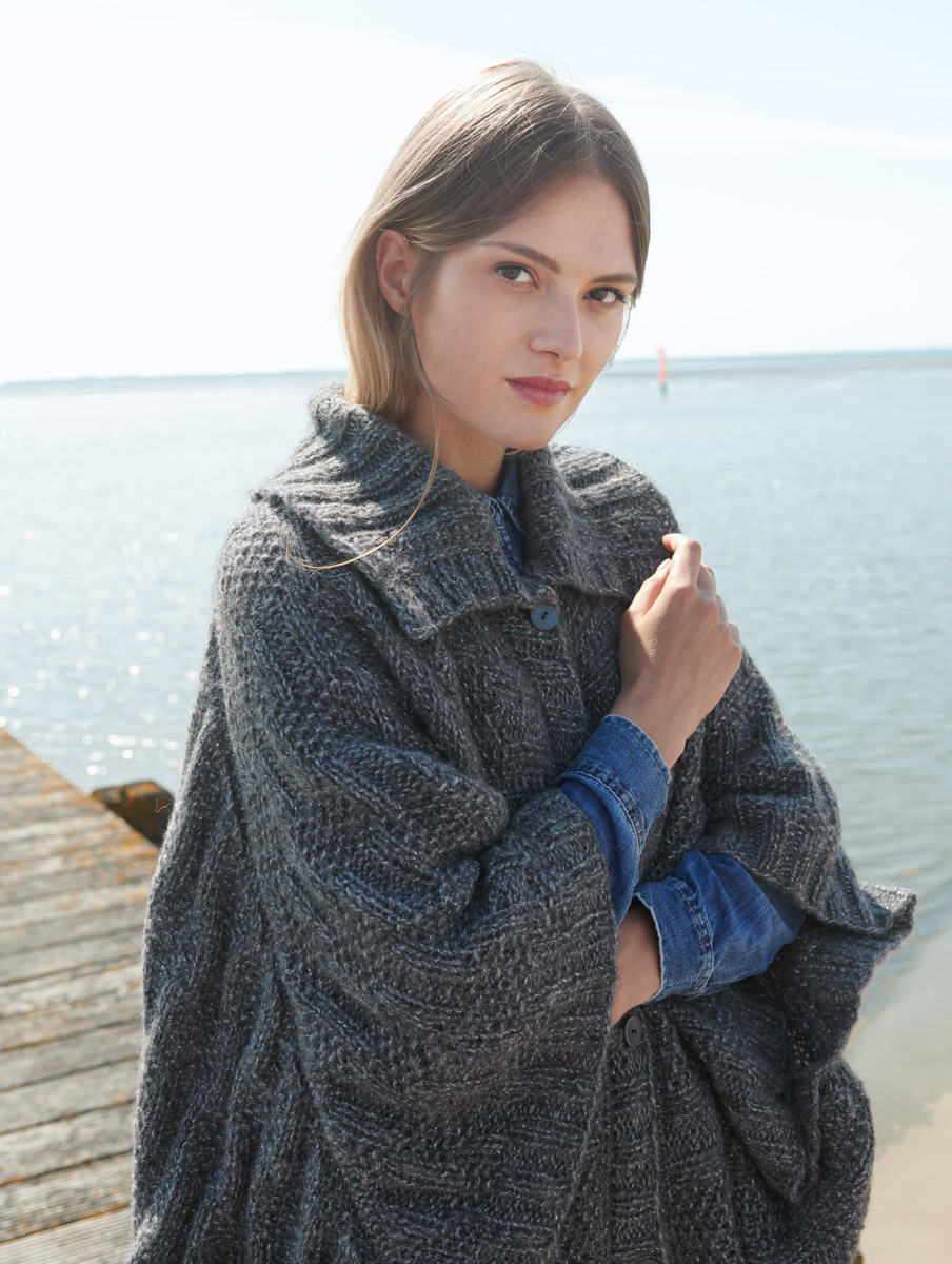 Lana Grossa-kvalitet „Lala Berlin Shiny” (46 % (baby) alpacka, 30 % bomull, 8 % virgin ull (merino), 8 % polyester, 8 % polyamid, löplängd = ca. 150 m/50 g): ca. 550 g grå (färg 6); rundstickor nr. 6, 80 och 120 cm lång, rundstickor nr. 7, 80 och 120 cm långa, 1 virknål nr. 5; 4 pärlemorknappar från Union Knopf, art. 453037, diameter 20 mm, färg 78 mörk grå; sytråd.