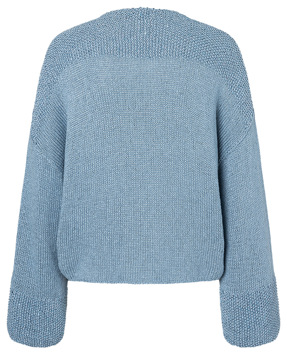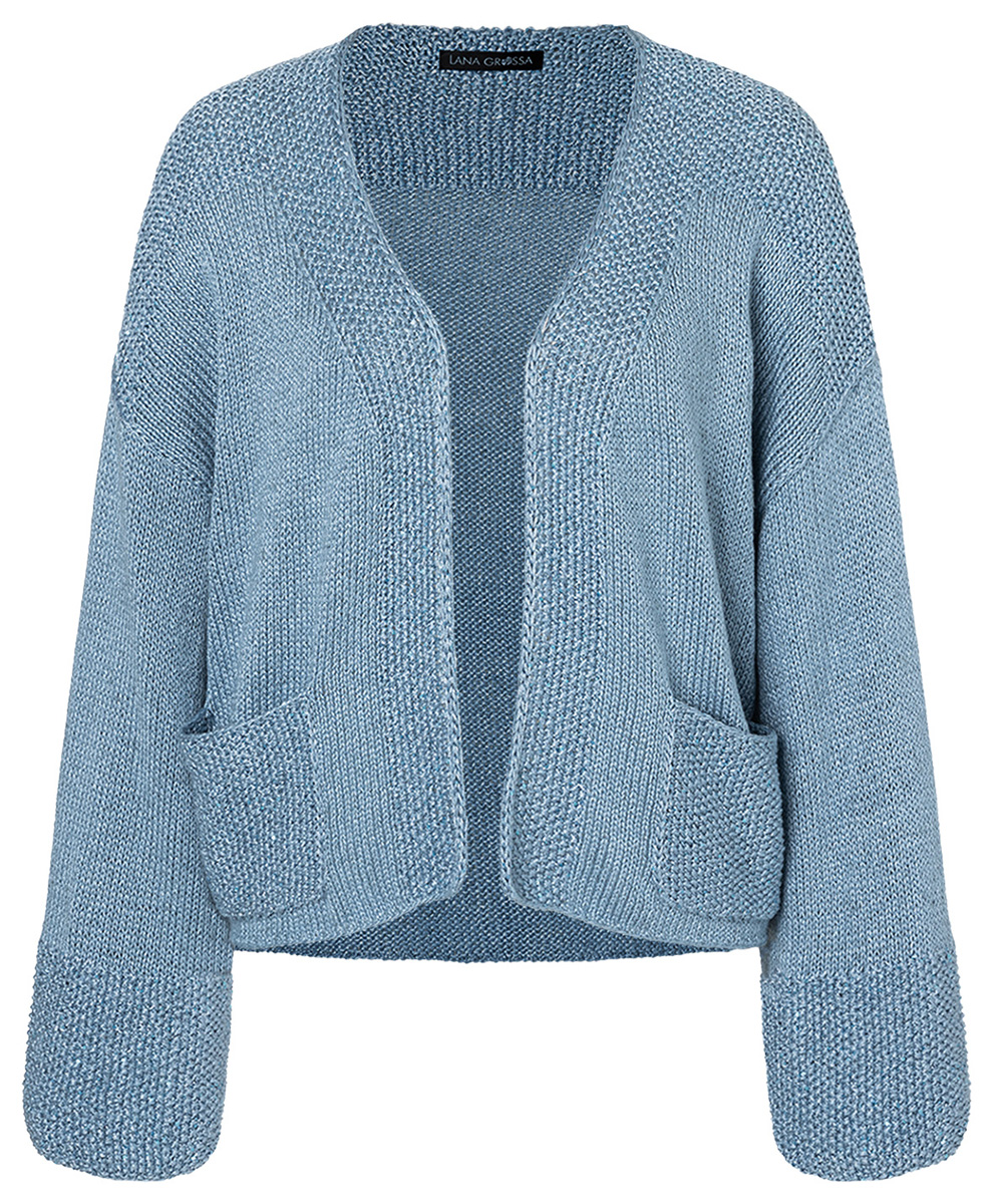 Lana Grossa Linarte (40% viskos, 30% bomull, 20% lin, 10% polyamid, löplängd 125 m/50 g), 550 (600 – 650) g gråblå (färg 76) och Lana Grossa Diamante (100% polyester, löplängd 195 m/25 g), 75 (100 – 100) g ljus blå (färg 9); stickor nr. 4 och 5.