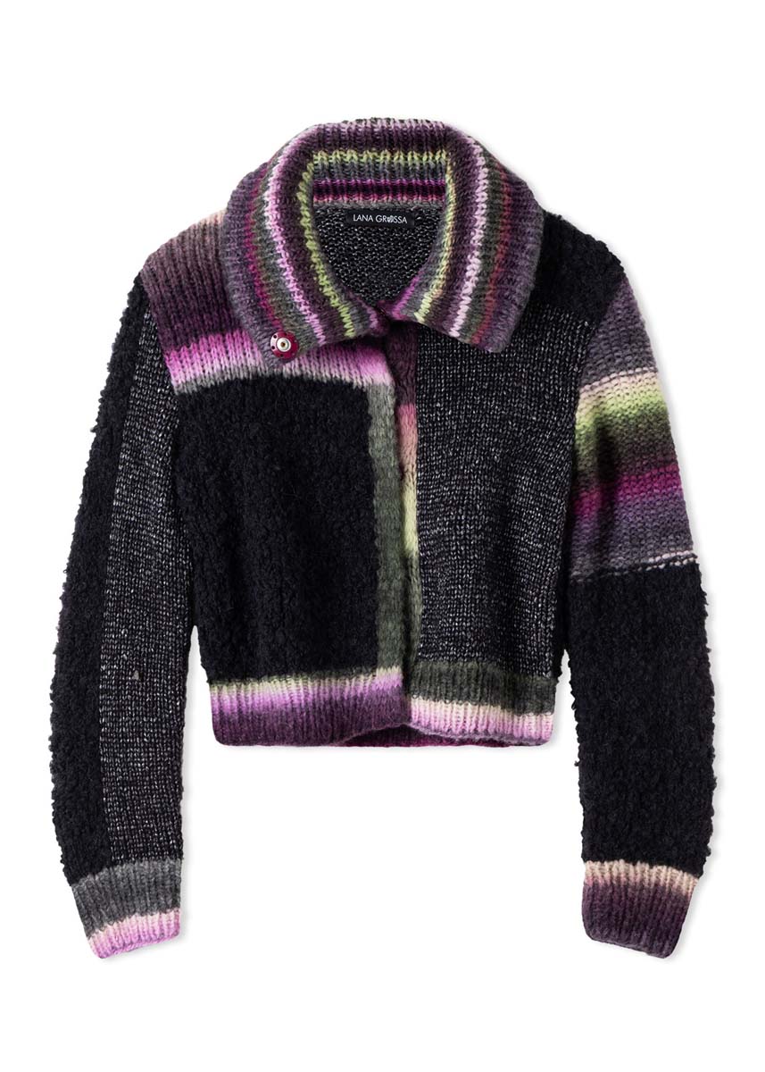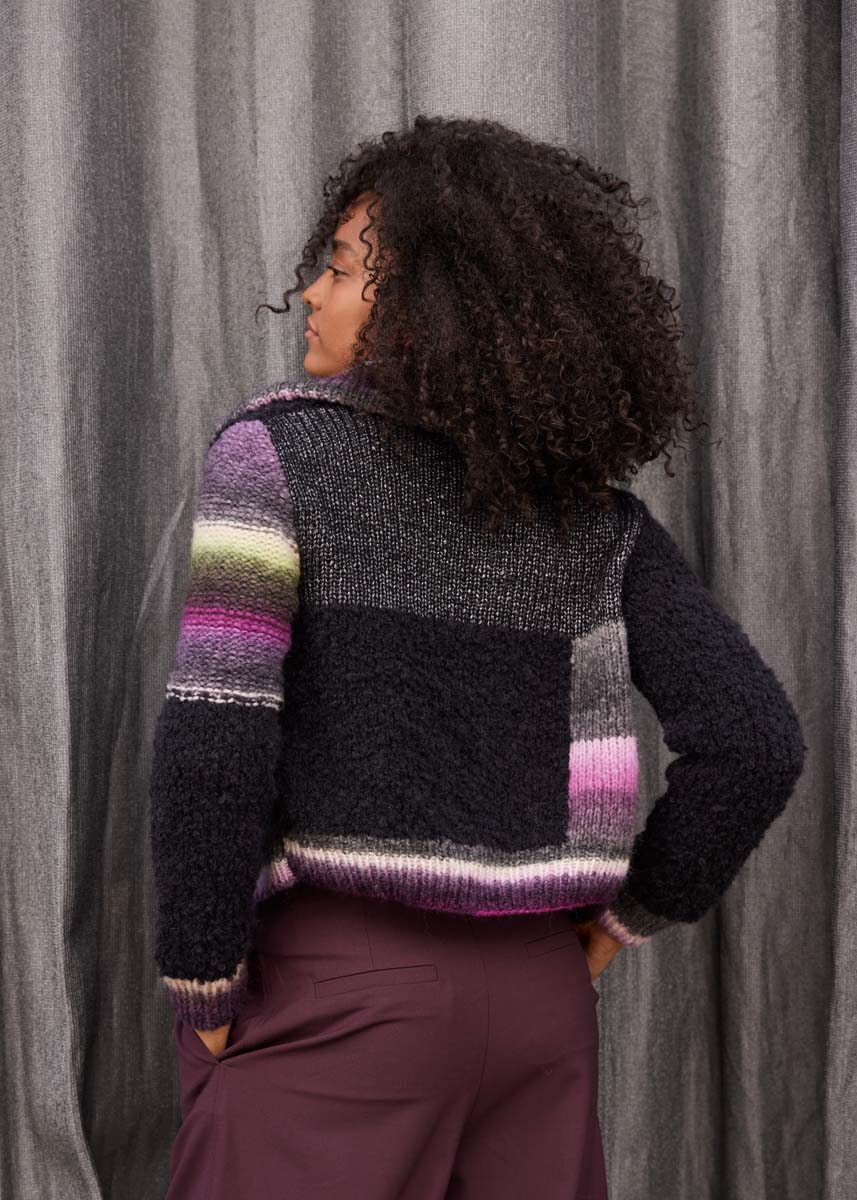 Lana Grossa Lucida (58% ny ull (merino), 42% viskose, løpelengde = ca. 100 m/50 g), 100 g i antrasitt (farge 6) og Lana Grossa Bomba (85% ny ull (merino ekstrafin), 15% polyamid, løpelengde = ca. 290 m/100 g) 200 (200 - 300) g i orkidé/bjørnebær/gråbeige/grågrønn/mørkgrå (farge 10) og Lana Grossa Orsetto (60% ny ull (merino), 40% alpakka (superfin), løpelengde = ca. 75 m/50 g), 200 (200 - 250) g i svart (farge 15); strikkepinne nr. 4 og nr. 6; 1 rundpinne nr. 4; 2 hjelpepinner; 6 trykknapper for påsying, ca. 25 mm Ø i mørkrød.