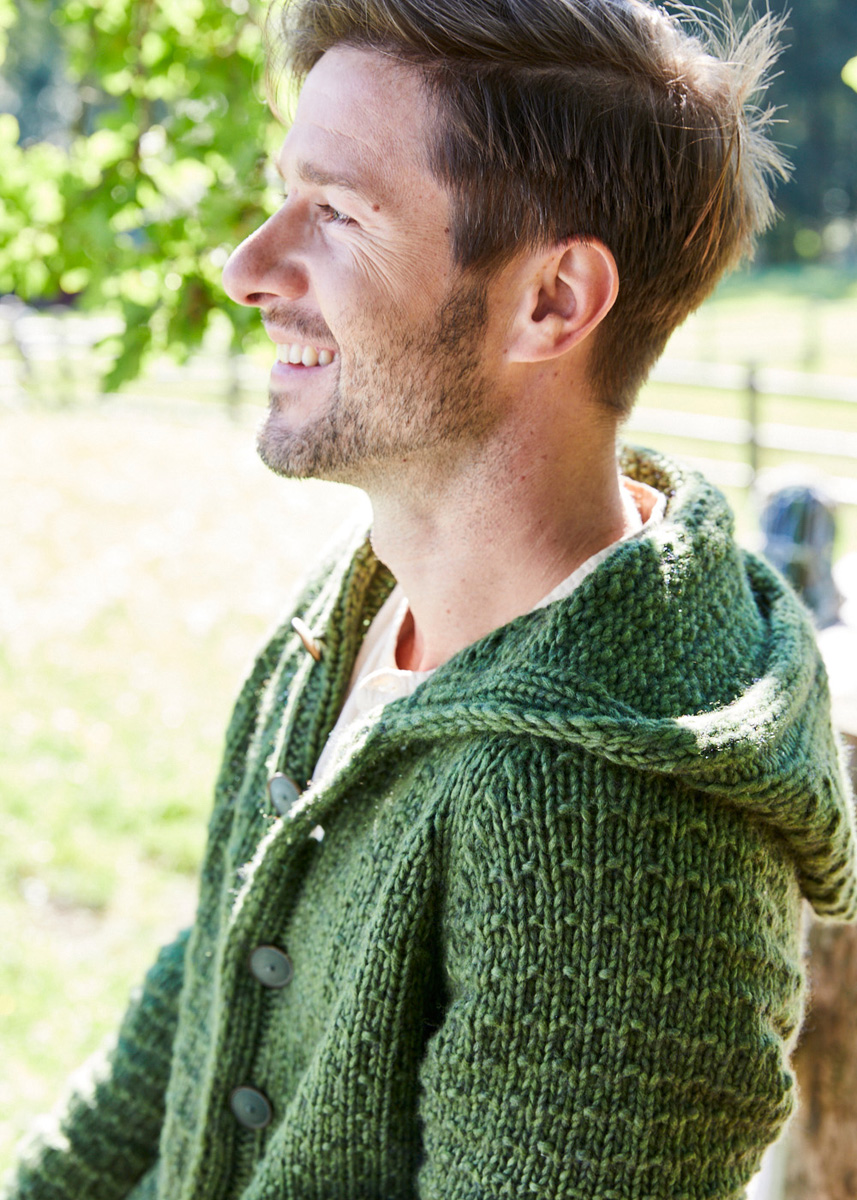 Lana Grossa-kvalitet „Landlust Winterwolle“ (50% ren ny ull merino, 35% bomull, 15% jak, löplängd ca. 70 m/50 g), 750 (800 - 850) g mossgrön melerad (färg 14); stickor nr. 8 och nr. 9, 1 rundsticka nr. 8, 40 cm lång, 1 virknål nr. 7; 9 gröna knappar, 25 mm ø från Union Knopf, Art. 453728, färg 28.