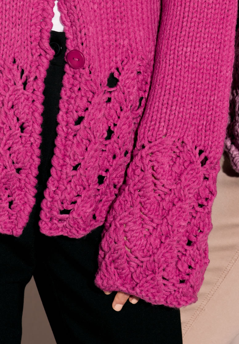 Lana Grossa-kvalitet ”Mille II” (50 % ren ny uld, 50 % polyakryl, løbelængde = ca. 55 m / 50 gr.): ca. 600(650/700) gr. fuchsia (fv. 84), strikkepinde nr. 7, hæklenål nr. 6, 5 knapper fra Union Knopf (art. 415978) 22 mm Ø.
