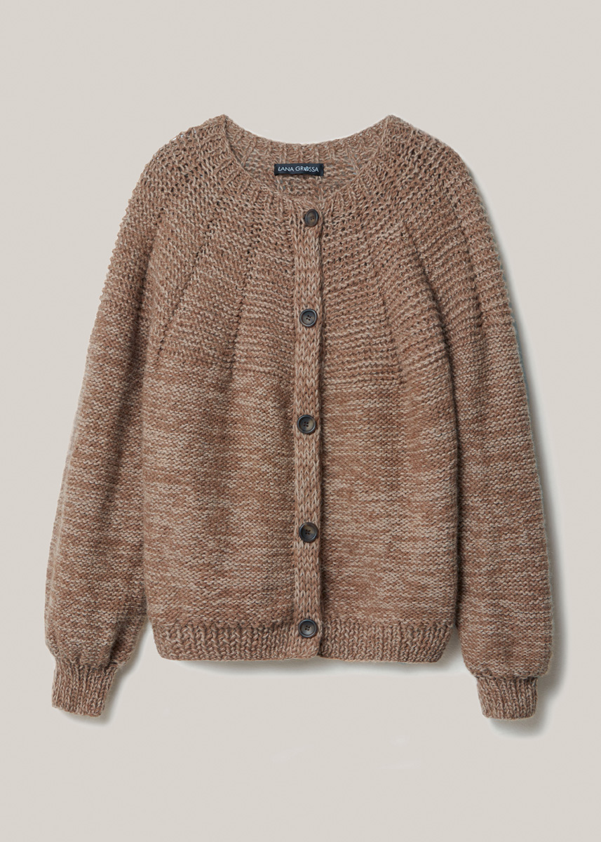 Lana Grossa-kvalitet „Natural Alpaca Classico” (85 % (baby) alpacka, 15 % ren ny ull (merino), löplängd = ca. 125 m/50 g): je ca. 350 (400) g nougat (färg 107) och kamel (färg 106); 1 rundsticka nr. 5, 80 cm lång, rundstickor nr. 6, 40, 80 och 120 cm lång, strumpstickor nr. 5 och 6; 5 hornknappar i mörkbrun, ø 22 mm. Tips: St allt med dubbla trådar, 1 tråd i varje färg!