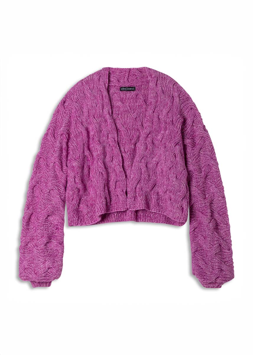 Lana Grossa-kvalitet „Natural Alpaca Pelo” (63 % bomull, 31 % (baby) alpacka, 6 % ren ny ull (merino), löplängd = ca. 125 m/50 g): ca. 650 g fuchsia melerad (färg. 29); stickor nr. 5,5, 1 rundsticka nr. 5,5, 120 cm lång.