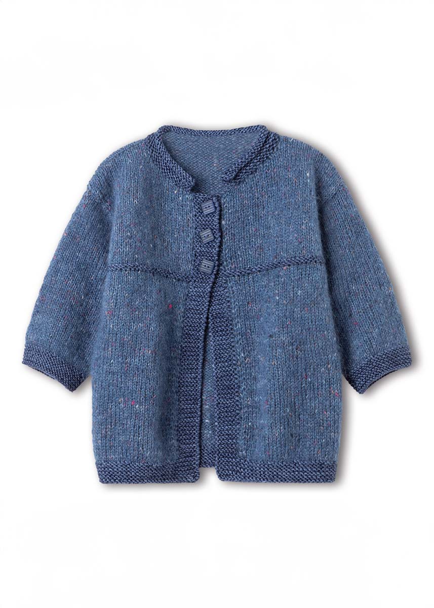 Lana Grossa Natural Superkid Tweed (60 % mohair (superkid), 30 % silke, 7 % bomuld. 3 % polyester), løbelængde = ca. 200 m / 25 gr): 100 (100 – 125 – 150) gr mørkeblå (fv 619) og Lana Grossa Cool Wool Big Vintage (100 % ren ny uld (ekstrafin merino), løbelængde = ca. 120 m / 50 gr.): 50 (50 – 50 – 50) gr mørkeblå (fv 7166), rundpind nr. 3½ og 4, 3 knapper 15 mm Ø.