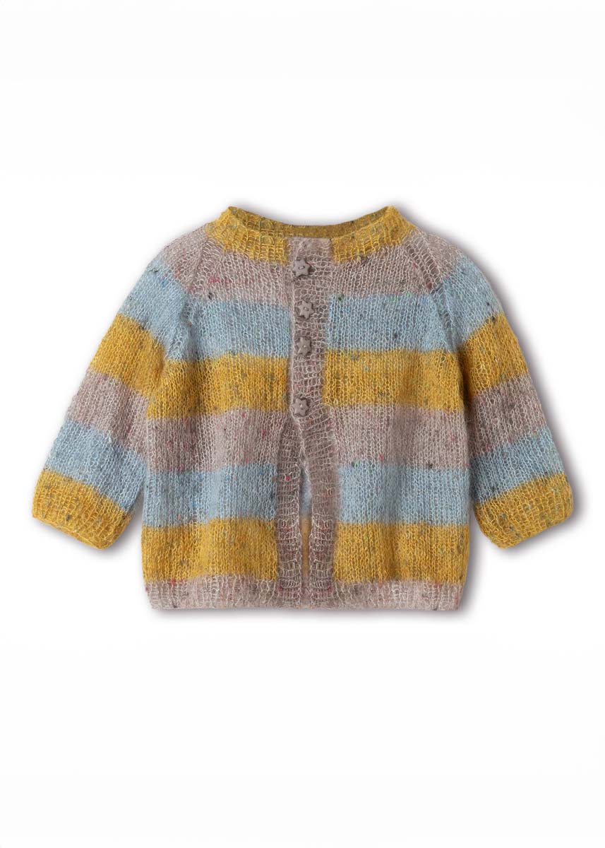Lana Grossa Natural Superkid Tweed (60 % mohair (superkid), 30 % silke, 7 % bomuld, 3 % polyester, løbelængde = ca. 200 m / 25 gr.): 25 (25 – 25 – 25) gr sennep (fv 615), lyseblå (fv 618) og lysegrå (fv 623), rundpind nr. 4, maskemarkører, 4 stjerneknapper 12 mm Ø.