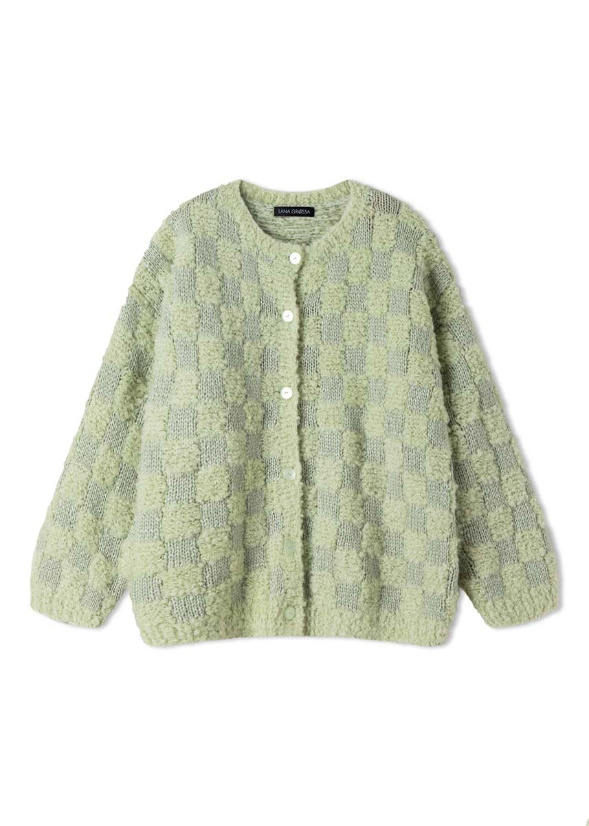 Lana Grossa Orsetto (60% ny ull (merino), 40% alpakka (superfin), løpelengde 75 m/50 g), 400 g i hvitgrønn (farge 10) og Lana Grossa Lucida (58% ny ull (merino), 42% viskose, løpelengde 100 m/50 g), 250 g i hvitgrønn (farge 19); strikkepinner nr. 4,5 og nr. 5; 1 rundpinne nr. 4,5, 60 cm lang; 6 lysgrønne knapper, 20 mm Ø.