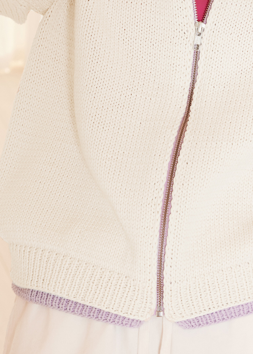 Lana Grossa-kvalitet „Riserva” (70 % bomull (bio), 30 % återvunnen polyamid, löplängd = ca. 125 m/50 g): je ca. 500 (550 - 600) g ecru (färg 2) och mjuk syren (färg 21); stickor nr. 4 (2x) och nr. 5, 1 rundsticka nr. 4, 50 cm lång; 1 syrenfärgar delbart bilxtlås, 60 cm lång.