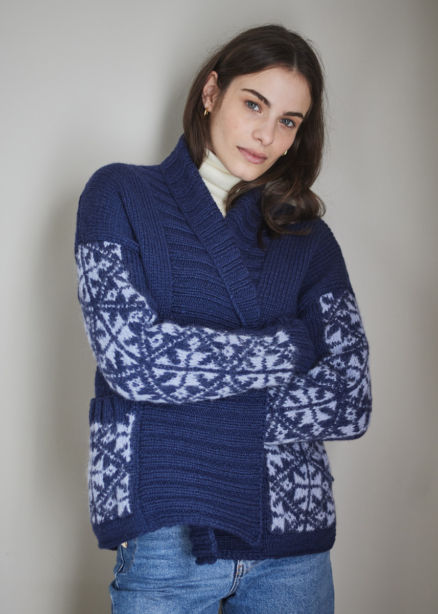 Lana Grossa-kvalitet „Setasuri Big“ (70 % alpacka (Suri), 20 % silke, 10 % ren ny ull (merino), löplängd = ca 100 m/25 g): ca 50 g violblå (färg 511); och „Cool Merino Big“ (90 % ren ny ull (merino), 10 % polyamid, löplängd = ca 90 m/50 g): ca 700 (750 - 800 - 850) g marin (färg 206); stickor nr. 5 och 6.