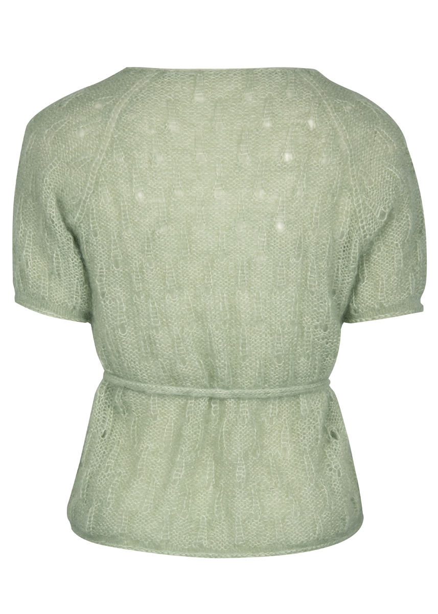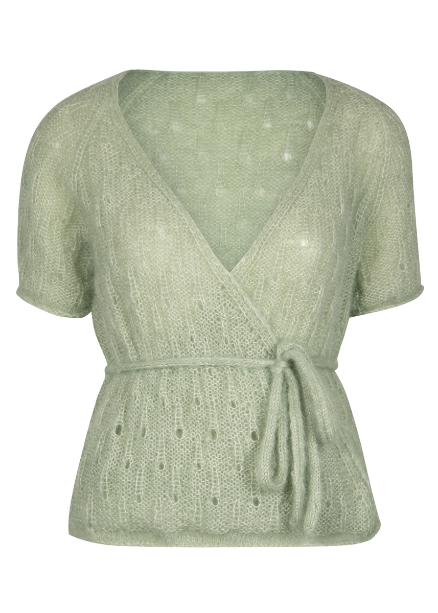 Lana Grossa-kvalitet ”Silkhair” (70 % (superkid) mohair, 30 % silke, löplängd = ca. 210 m / 25 gr.): ca. 175(200-225) gr ljus grön (färg 140), stickor nr. 4 och 5, rundsticka nr. 5, 80 cm, virknål nr. 3½, 2 strumpstickor nr. 3½.