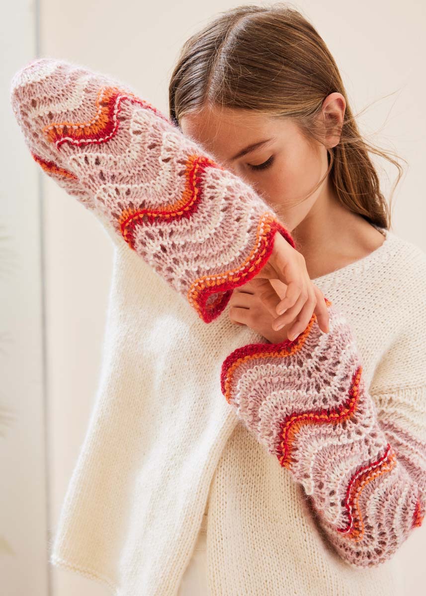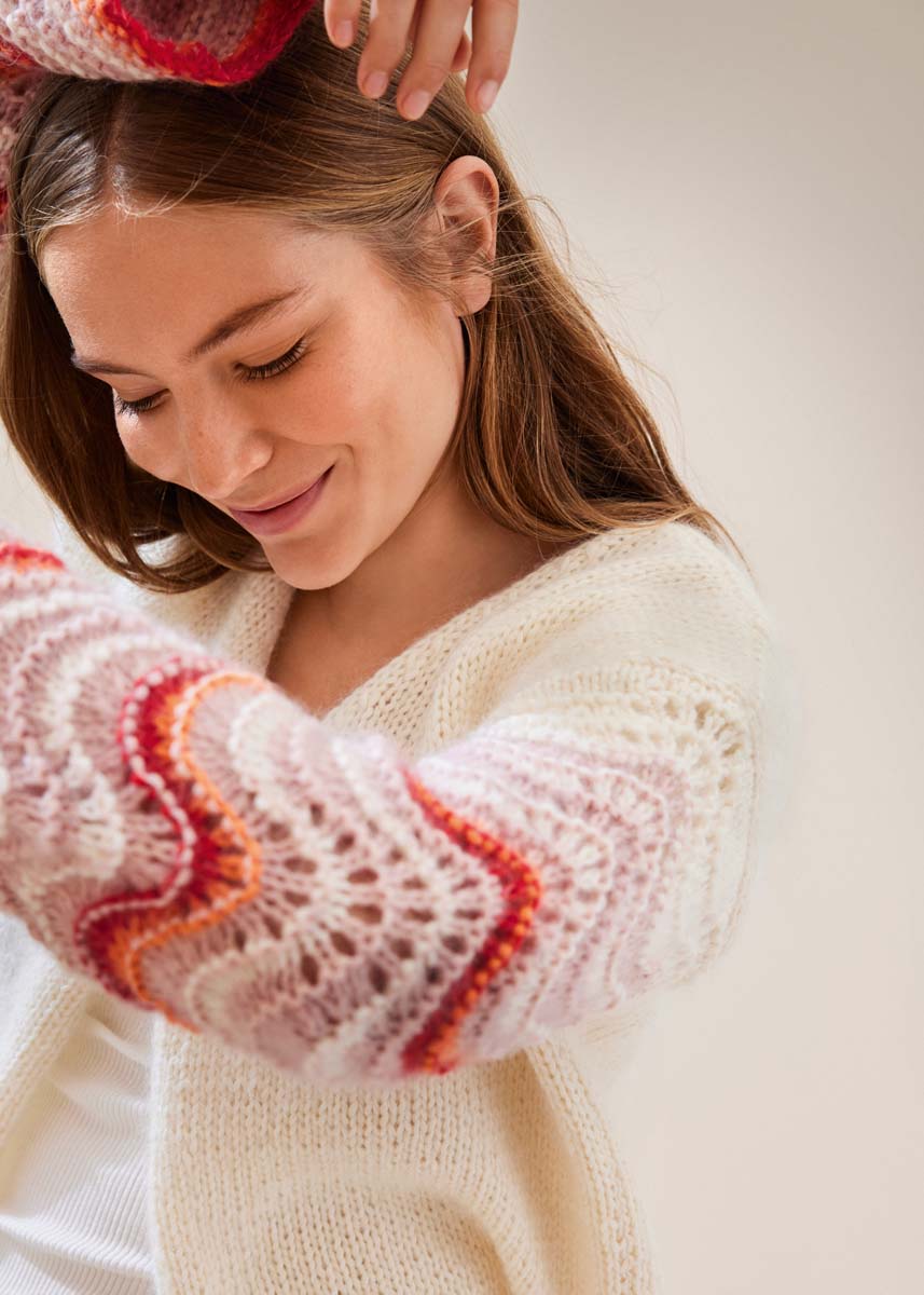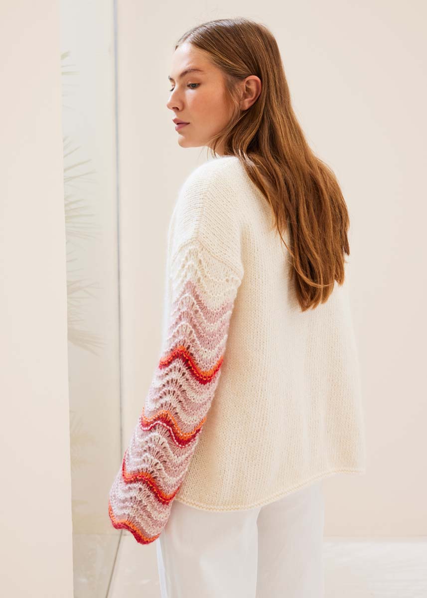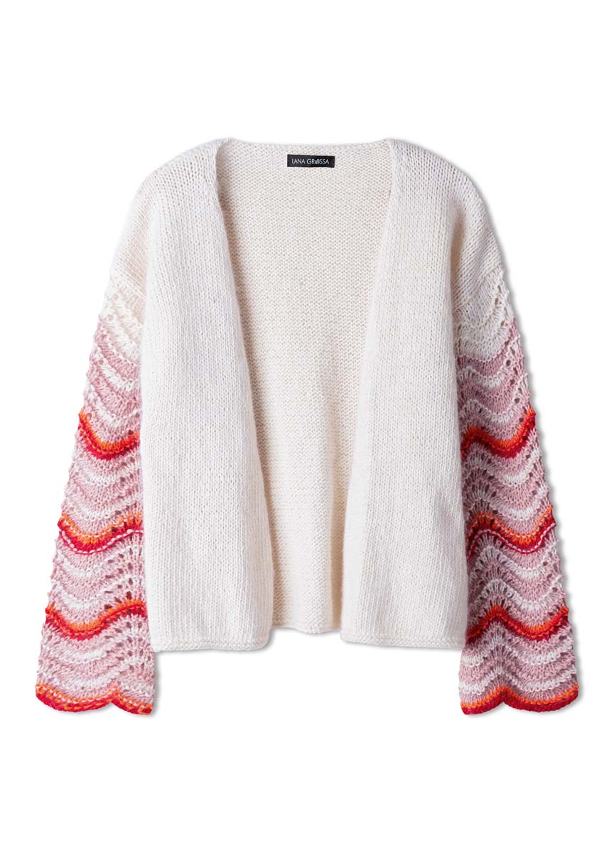 Lana Grossa-kvalitet „Silkhair“ (70 % mohair (superkid), 30 % silke, löplängd = ca 210 m/25 g): ca 25 (25) g bonbonröd (färg 198), ca 25 (25) g pumpa (färg 190), ca 25 (25) g rosa (färg 85) och ca 125 (150) g vit (färg 117); Lana Grossa-kvalitet „Summer Softness“ (80 % bomull (bio), 20 % ren ny ull (superfin merino), löplängd = ca 130 m/50 g): ca 50 (100) g röd (färg 7), ca 50 (100) g pumpa (färg 6), ca 50 (100) g pastellrosa (färg 10), ca 350 (450) g creme (färg 2); stickor nr. 6; 1 kort rundsticka nr. 5,5.