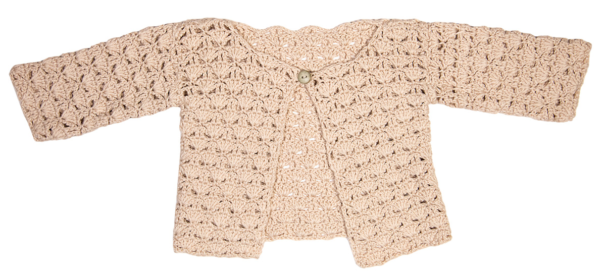 Lana Grossa-kvalitet ”Linarte” (40 % viskose, 30 % bomuld, 20 % hør, 10 % polyamid, løbelængde = ca. 125 m / 50 gr.): ca. 150 gr hvid (fv 1), strikkepinde nr. 3½, rundpind nr. 3½, 40 cm, 3 knapper 10 mm Ø.